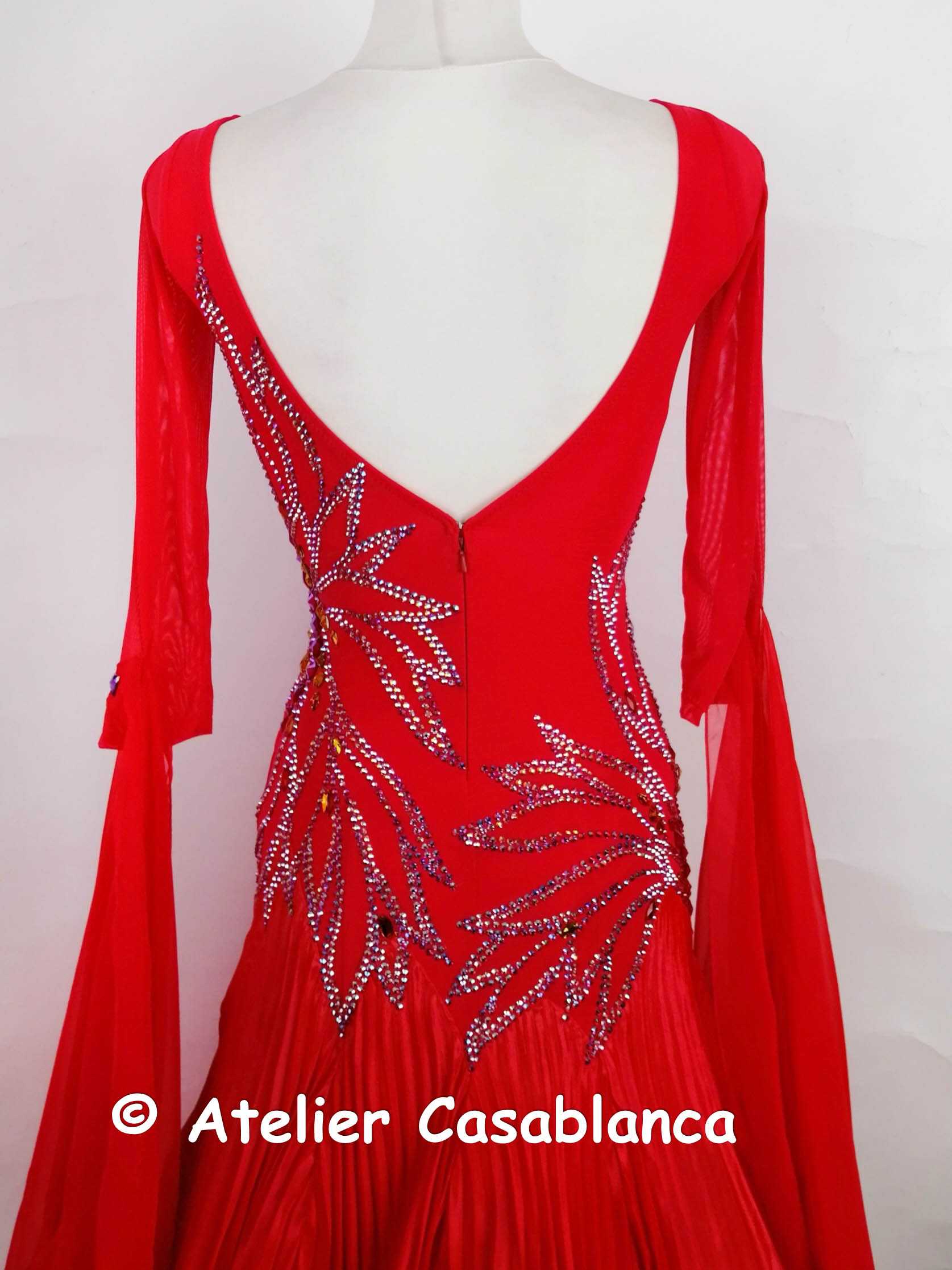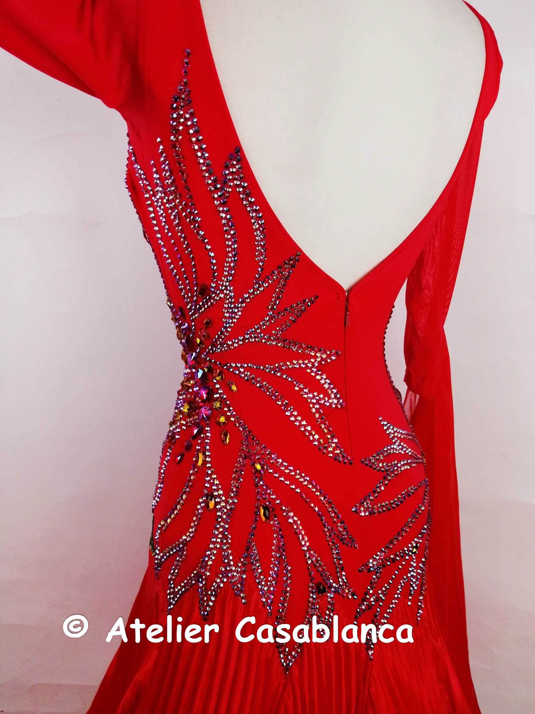 袖があり、後ろにファスナーがあって背中の開きもあまり深くしていないデザイン。デコルテラインはカタリーナ特有の首のラインが美しく見えるラウンドネックで、ボディには左右対称になり、特にホールドしているときに最も見えやすい左サイドから後ろにかけて大きな花の絵柄が石だけで描かれています。赤のオーロラのプレチオサを使っているので非常に美しく輝き、大きな石使いもとてもきれいです。