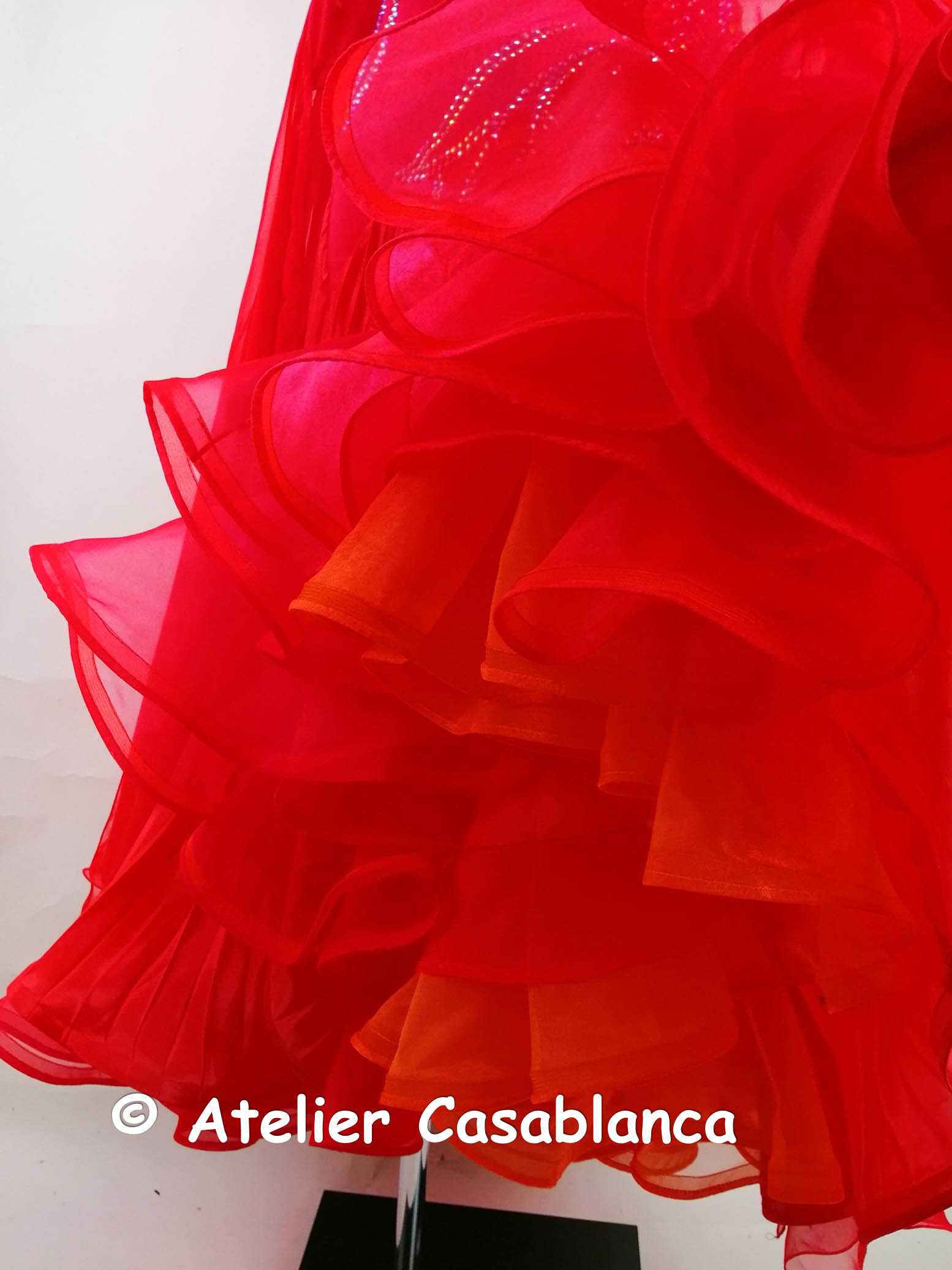 スカートはカタリーナ特有の美しい型紙で作られたオーガンジーのパニエのアンダースカートの上にプリーツ加工された赤のスカートを重ねており、裾にはホースヘアが使われているので軽くてとてもダイナミックに美しく踊ります。