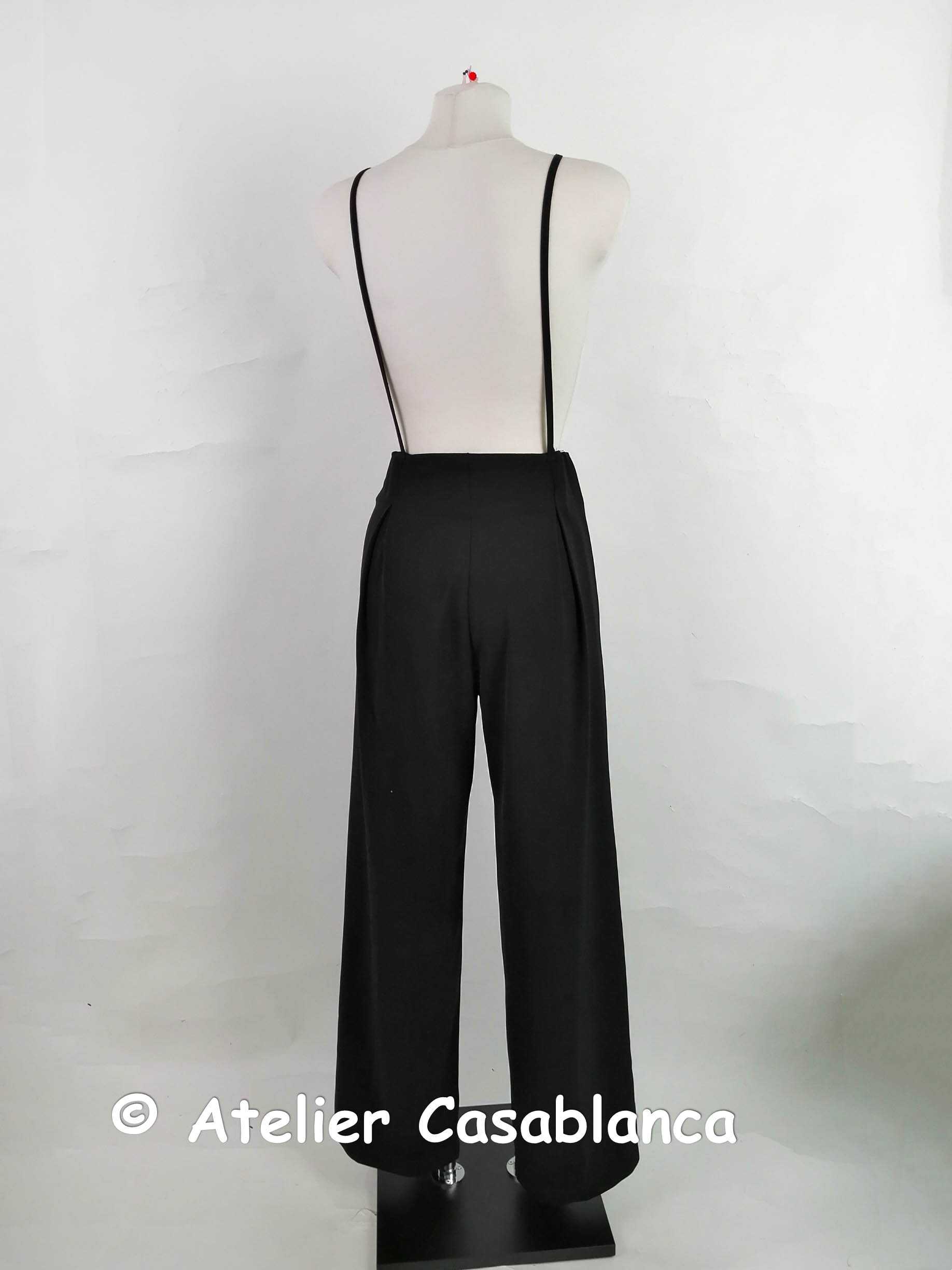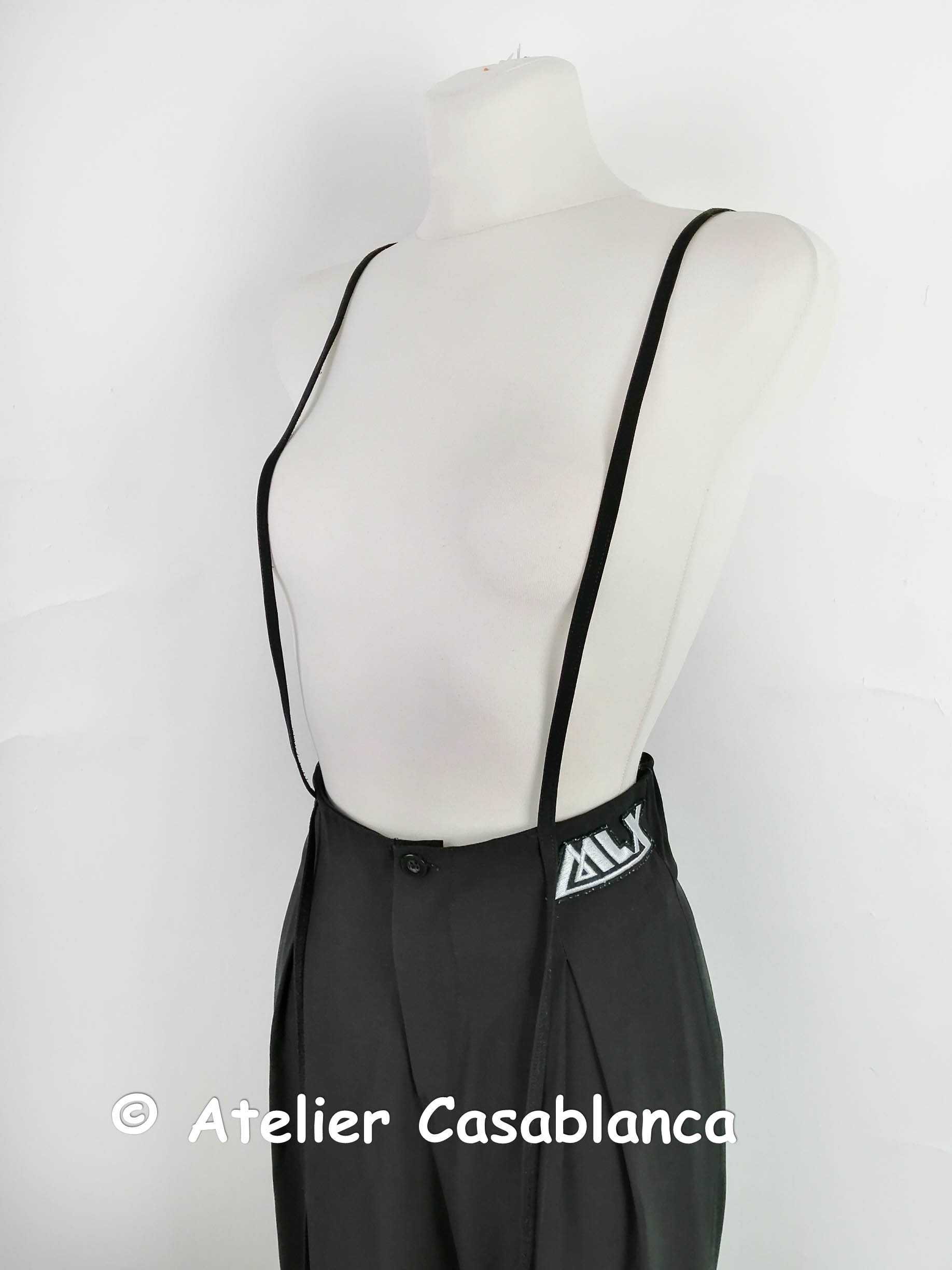 前途にタックが入っているデザインでウェストはゴムになっている部分があるので着脱しやすい構造になっています。素材は男性用のラテンパンツのようなしっかりとした布で、若干ストレッチ性もあり、縫製も丁寧でとても着心地の良いウェアです。
