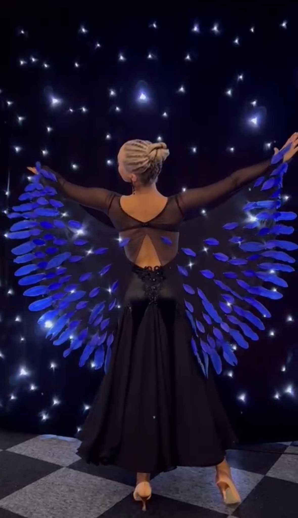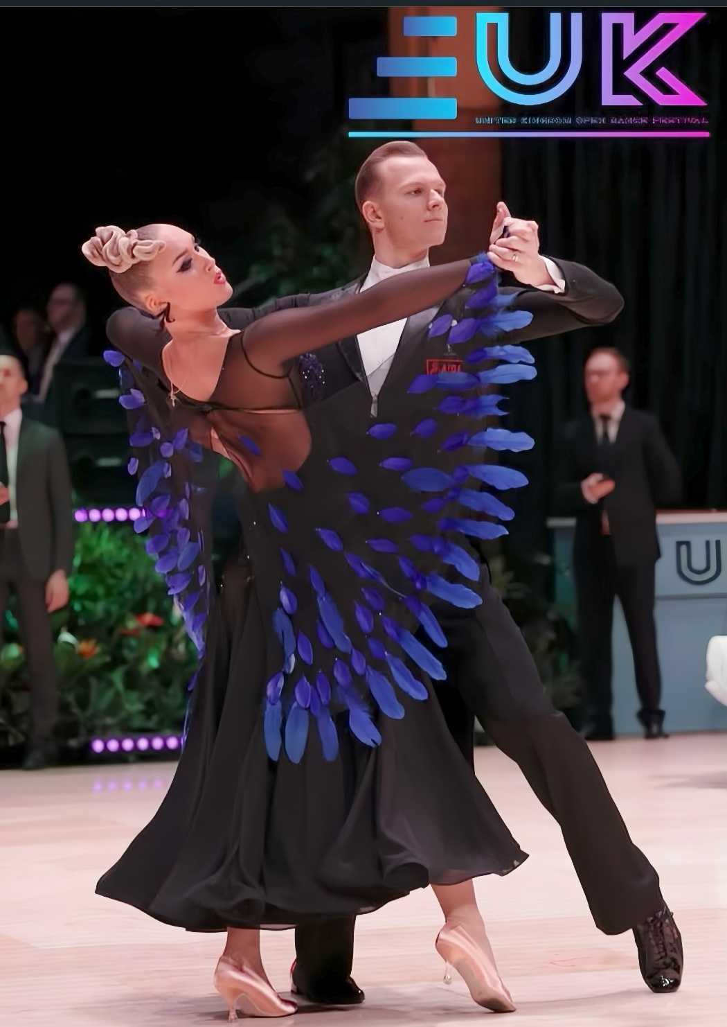 ブラックプールプロフェッショナルライジング戦でセミファイナルに入賞した大変素晴らしいロシア出身のイタリアのダンサー、ナタリア・パブロワ選手のために、ロシアの素晴らしいブランド、「ミントクチュール」が制作した、フロートのデザインが超素晴らしいベルベット素材のながそでの黒&コバルトブルーのスタンダードドレスです。
