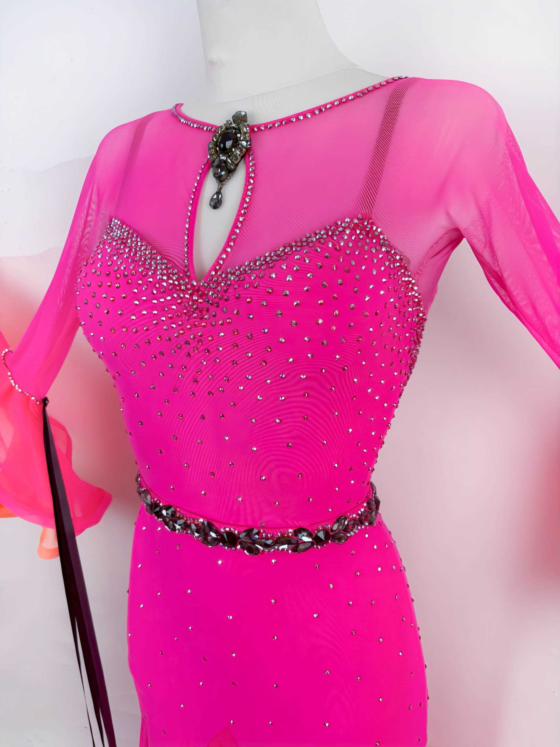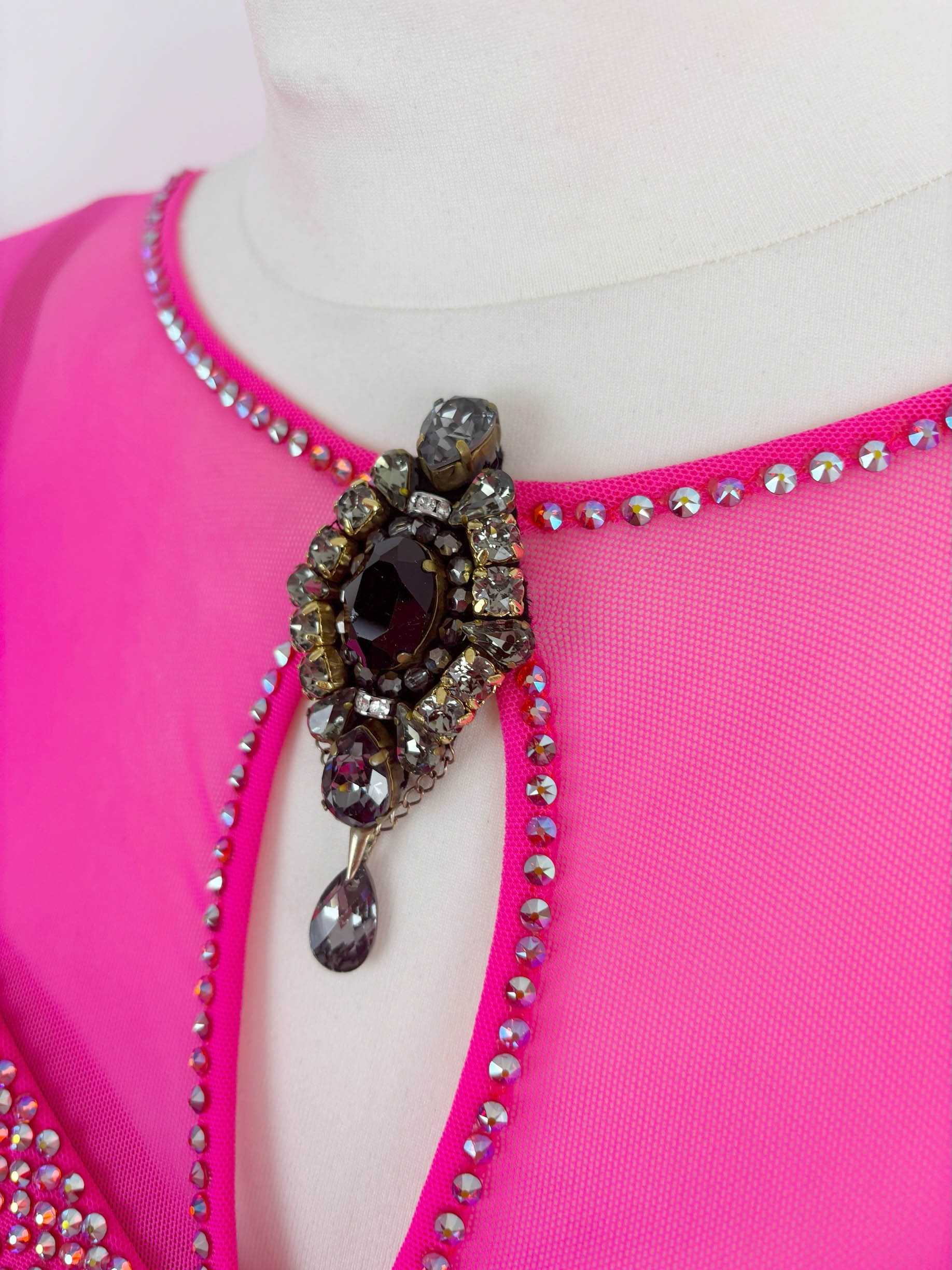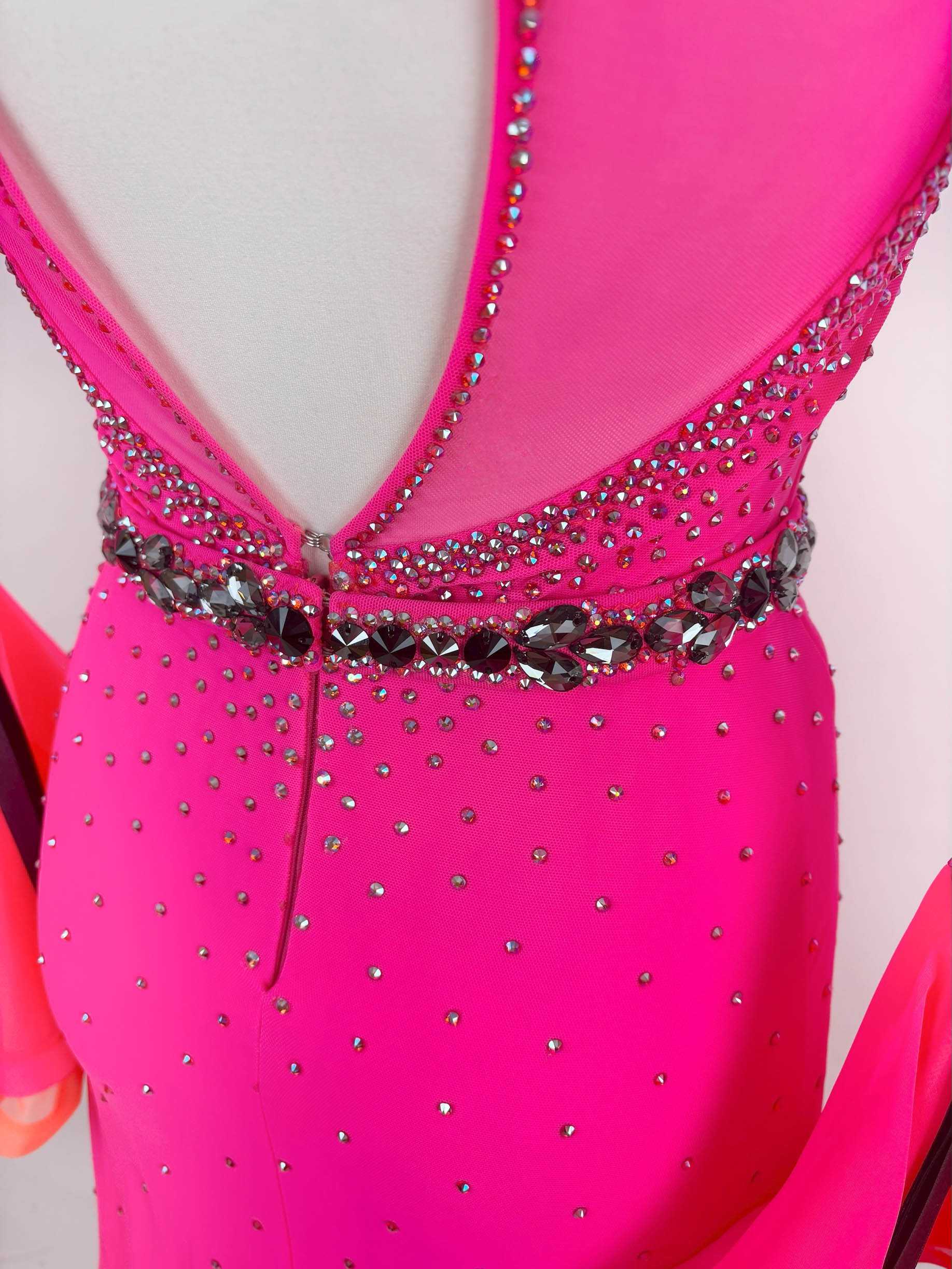 胸元と背中のジェットとブラックダイヤモンドを使ったオーナメントのデザインがいかにもDLKらしいスタイリッシュなドレスで、ボディ部分にはピンクのオーロラのスワロフスキの石が貼られています。