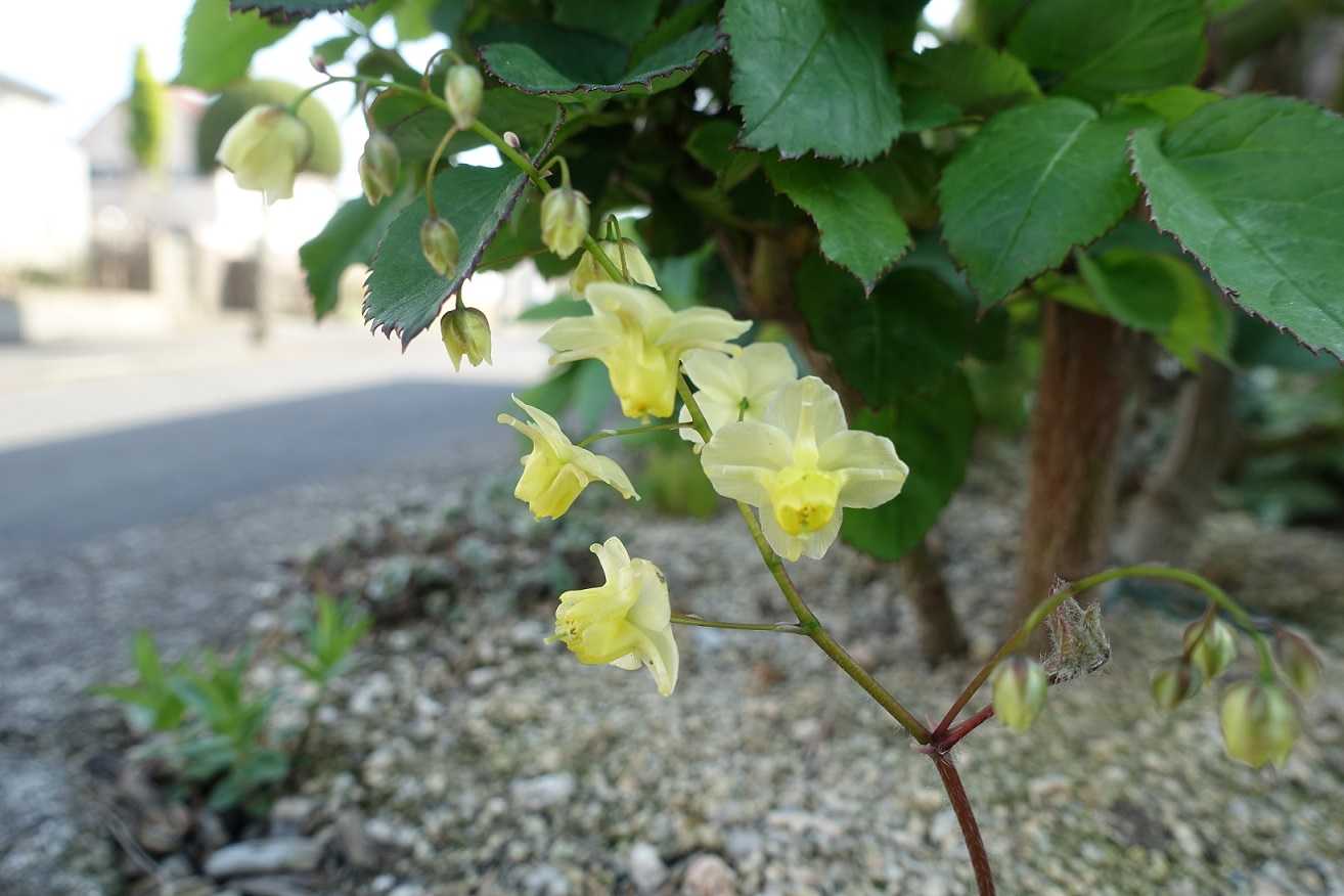 バラ の株元近くから顔を出して来た 黄花イカリソウ(外国産)