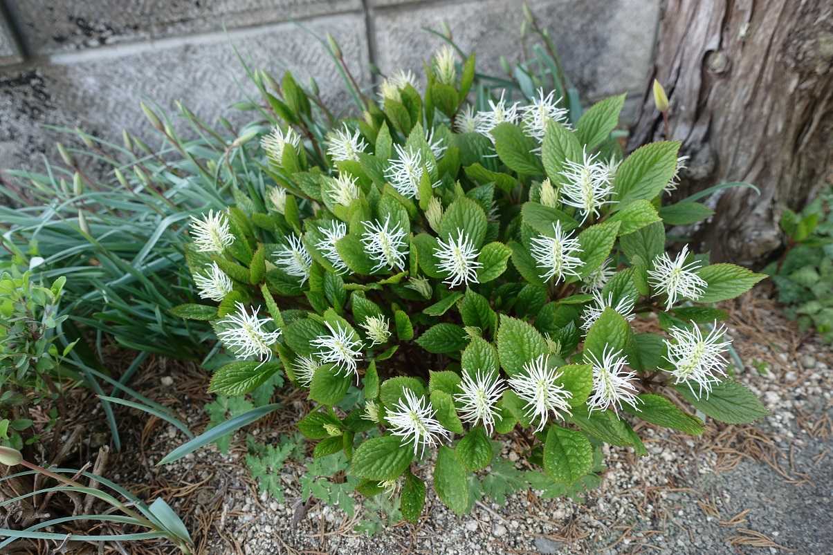 玄関先の植え込みに植えている 2色咲き品種 多摩の源平