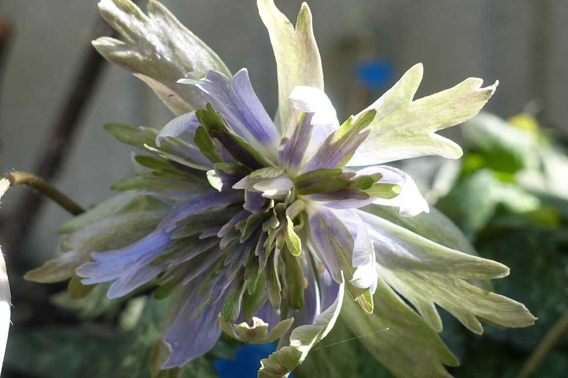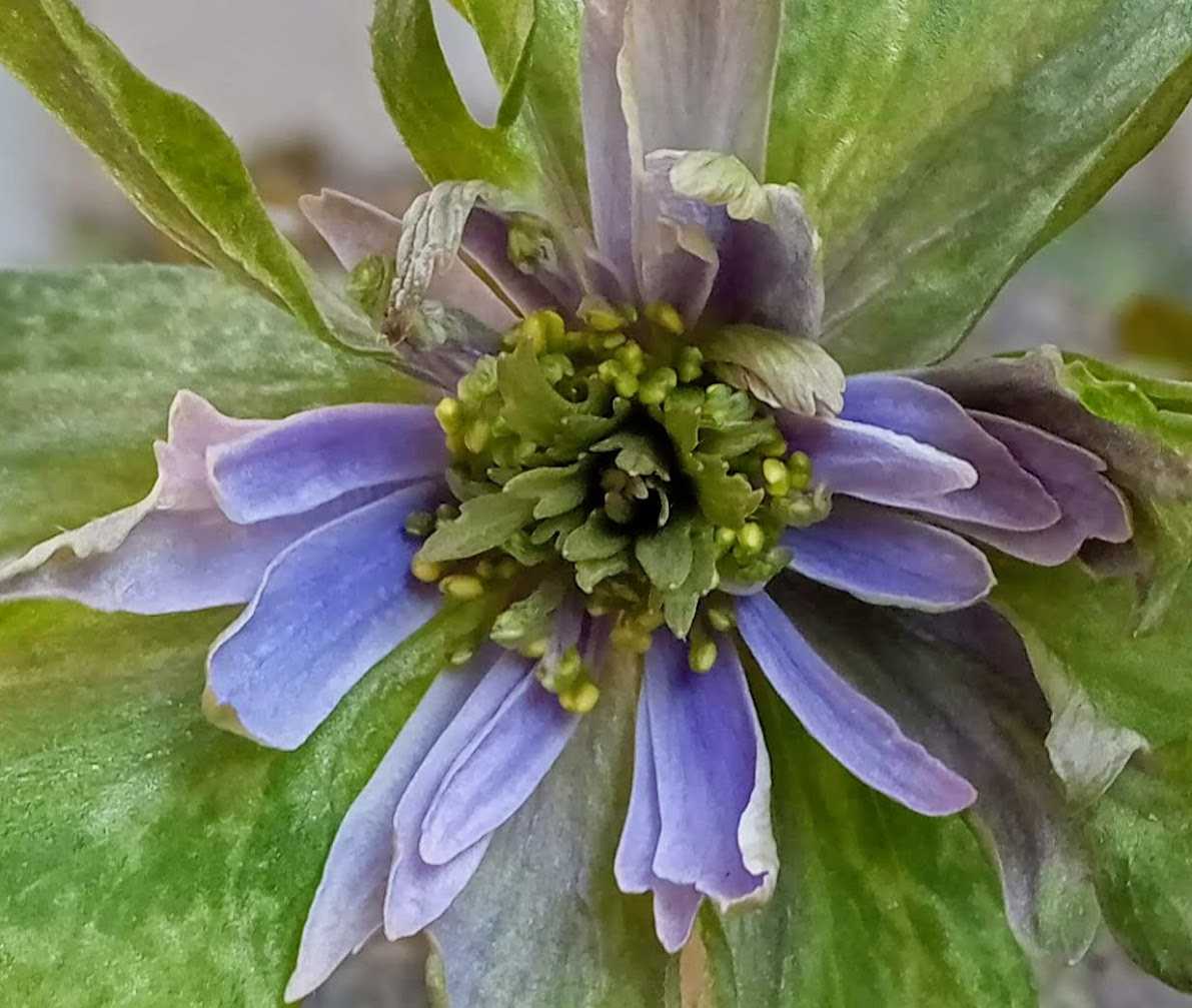 内側の濃いモスグリーンの花弁は、内側から瑠璃色に変化しはじめています。