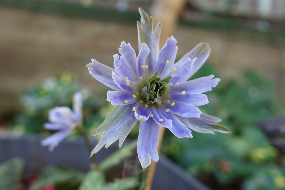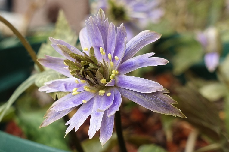 約一年振りの投稿になります。 今年もユキワリイチゲの咲く季節になりました。例年1月下旬には咲き出すユキワリイチゲの花、今年は例年と比べ寒い日が続き、やっと2月下旬から咲き出しました。 ユキワリイチゲの3段花 我が家の庭で、例年真っ先に咲き出すのはユキワリイチゲの3段花と決まっています。通常、1月末頃から咲き出しますが、今年は寒く、例年と比べ、約20日程遅れての開花となりました。 ユキワリイチゲの3段花は、本来の雌しべが花弁(萼片)に変異した個体で、それが一時的な変異ではなく固定したものです。 本来の雌しべの位置に出る花弁は、濃いモスグリーン色で出て、咲き進むに従って長く伸び、花弁の色は明るいモスグリーン変わり、最終的には瑠璃色に変わっていきます。 モスグリーンから瑠璃色に変化したユキワリイチゲの3段花 鉢植えのユキワリイチゲの3段花 この個体は3段花の株ですが、3段花になっていません。従って3段花には無い雌しべが、通常花と同様に存在します。 例年、こういう個体も出現しますが、栄養不足なのか?原因はよくわかりません。今後、肥培に成功すれば、来年は3段花で咲く可能性があります。 この個体は、一本の花軸に2つの花が咲く、いわゆる変異咲きです。 変異花が良く出る、と云われるキンポウゲ科のユキワリイチゲ、珍しい現象ではありません。 ユキワリイチゲの標準花も少しづつ咲き出しました。庭のあちこちに植えています。 昨日あたりからまた冷え込んでいて、ユキワリイチゲの花は閉じたままです。ユキワリイチゲは、気温に非常に敏感で、気温12~13度以上でなおかつ、お日様が当たらないと開いてくれません。非常に気難しい花なんです。 節分草もやっと開花してきました。 8年ほど前、貰った種を蒔いて育てたものです。 素芯花も混じっています。 遅い春も、やっと本番を迎えようとしています。 今日はこの辺で。
