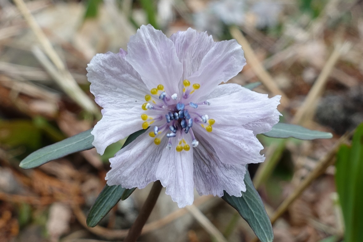 今日の最高気温22℃、今年初めての20℃超え!少し体を動かすと、汗ばむほどの暖かさでした。 庭のユキワリイチゲ 、ほぼ80%程が開花しました。 その中でも早咲きの、ユキワリイチゲの3段花がピークを迎えています。 一番早く咲き出した株は、すでにピークを過ぎたようです。 今日はユキワリイチゲの3段花に絞って、現状紹介をします。 まさに今がピークと言えるユキワリイチゲの3段花。 咲き始め、花中央部の濃いモスグリーン色の花弁だったが、明るいグリーンに変化してきた。そして咲き進んた花弁が、かなり長くなってきて、外側の花弁の長さに近づいてきた。 咲き始めの頃の花姿 長く伸びてくると同時に、花弁の色も徐々に中心部から瑠璃色に変わっていきます。 この個体は、すでにほぼ中央の花弁の色は、瑠璃色に変わっています。 この個体は、花弁の長さは、まだそんなに伸びていませんが、すでに、ほぼ瑠璃色に変化しています。個体差によるものと思われます。 3段花の大きな特徴の一つとして、「花弁先端に大きな切れ込みが入る」があります。が、この個体はその切れ込みが全くなく、標準化の花姿をしていて、雌しべ部分のみが花弁に変異している。 非常に珍しいケースの3段花だと言えます。 私と花友2人で、ユキワリイチゲの3段花を発見したのが今から15年前(2010年)になりますが、このような花姿は全く初めて見ました。ある意味、先祖帰りした変異花と言えると思います。 この個体のように、特に「最外側の花弁は、かなり深い切れ込みが入り、花弁の色は薄いグリーン色が混じる」のが、通常の3段花です。 今年最初に咲いた(開花日 2025.02.14)ユキワリイチゲの3段花。開花してすでに37日目になりますが、まだまだ元気です。 ユキワリイチゲの3段花は、標準花に比べ開花期間がかなり長いのも特徴の一つです。 「その要因は、雌しべが変異し花弁になった。その花弁は開花している間少しづつ伸びます、栄養供給がその間ずっと続いていると考えられ、その事が長寿命になっている」のでは、と推察します。 明日、明後日も気温が高いまま推移する天気予報です。月曜日あたり、恒例の自生地巡りを予定しています。 今年はどんな花に巡り合えるか、非常に楽しみ!2人の花友と行ってきます!! 今日はこの辺で。