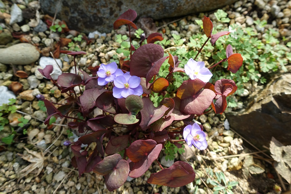 イカリソウに魅せられて、かなりの年月になる。白花から赤花、ピンク花、紫花、黄色花と多彩な花色が存在するのが最大の魅力と言えますが、基本形ハート型をした葉の形状もかなり変化に富む。 丸葉、細葉、亀葉(葉の先端部が3つの突起状となる)等。そして更に葉模様、葉色、特に新葉の紅葉を思わせる見事な葉色に感嘆させられる。 そんなイカリソウの魅力を、何回かに分けて紹介します。 まずトキワイカリソウ、常盤イカリソウとも表します。いわゆる常緑性で年間を通じて葉が着いています。 トキワイカリソウ赤花 咲き始めは濃い赤の花色だが、咲き進むとやや色落ちがある。 葉は細葉で、開花時の赤銅色の葉色が美しい! 花が終わる頃には濃い緑色の葉色に落ち着く。 次もトキワイカリソウ赤花 花弁、距、内萼片とも赤一色の綺麗なイカリソウです。 我家では一番の早咲きで、例年3月20日頃には咲き出します。スマートな花型が美しい。花は色落ちが少なく、最後まで赤い。葉はやや丸葉。 トキワイカリソウ ピンク花 随分と大株になったが、明るく華やかな雰囲気にしてくれる。この秋には株分け予定。イカリソウの周囲に見えている葉はユキワリイチゲ。ユキワリイチゲと入れ替わりに咲き出します。葉は整ったハート形に近い。 こちらもピンク系のトキワイカリソウ 花が終わったユキワリイチゲ(右側)の横で咲き始めました。 こちらもトキワイカリソウ ピンク花 柔らかなピンク系の花色で、内萼片の中心、基部に濃いピンク色のスポットが入ります。葉は細葉。 トキワイカリソウ ピンク系 この株はきっちり葉の上で咲くタイプで、トキワイカリソウには珍しいタイプ。花色は花弁の先端部がやや薄くなります。葉はやや細いハート形。 こちらもトキワイカリソウ ピンク系 このトキワイカリソウも、葉の上で咲くタイプです。スッキリした花色が美しい品種です。 葉の形状は、基本細葉ですが、丸葉に近い形状の葉が混じったり前述した亀葉(参照下写真)も約1割ほど混じるなど、大変珍しく貴重な株です。 トキワイカリソウ白花 県北から北の地方にトキワイカリソウ白花は多く自生していて県南ではまずお目にかかれない白花です。葉は丸葉に近い形状。トキワイカリソウには珍しい青軸(有毛)です。遅咲き品種で、4月中旬頃から咲き出します。 トキワイカリソウ白花 早咲きの小型のイカリソウ白花で、例年3月20日ごろから咲き出します。コロッとした可愛い花姿で、満開時にはまるでカモメが乱舞しているかのよう。 葉はやや細葉。トキワイカリソウの花色は、赤花、紫花、ピンク花、白花と ※黄色花こそありませんが多彩です。 ※黄色花については、広義には同じ常緑性(常盤性)で、本州中部~北海道にかけて自生する黄花イカリソウがあります。 今日はこの辺で。