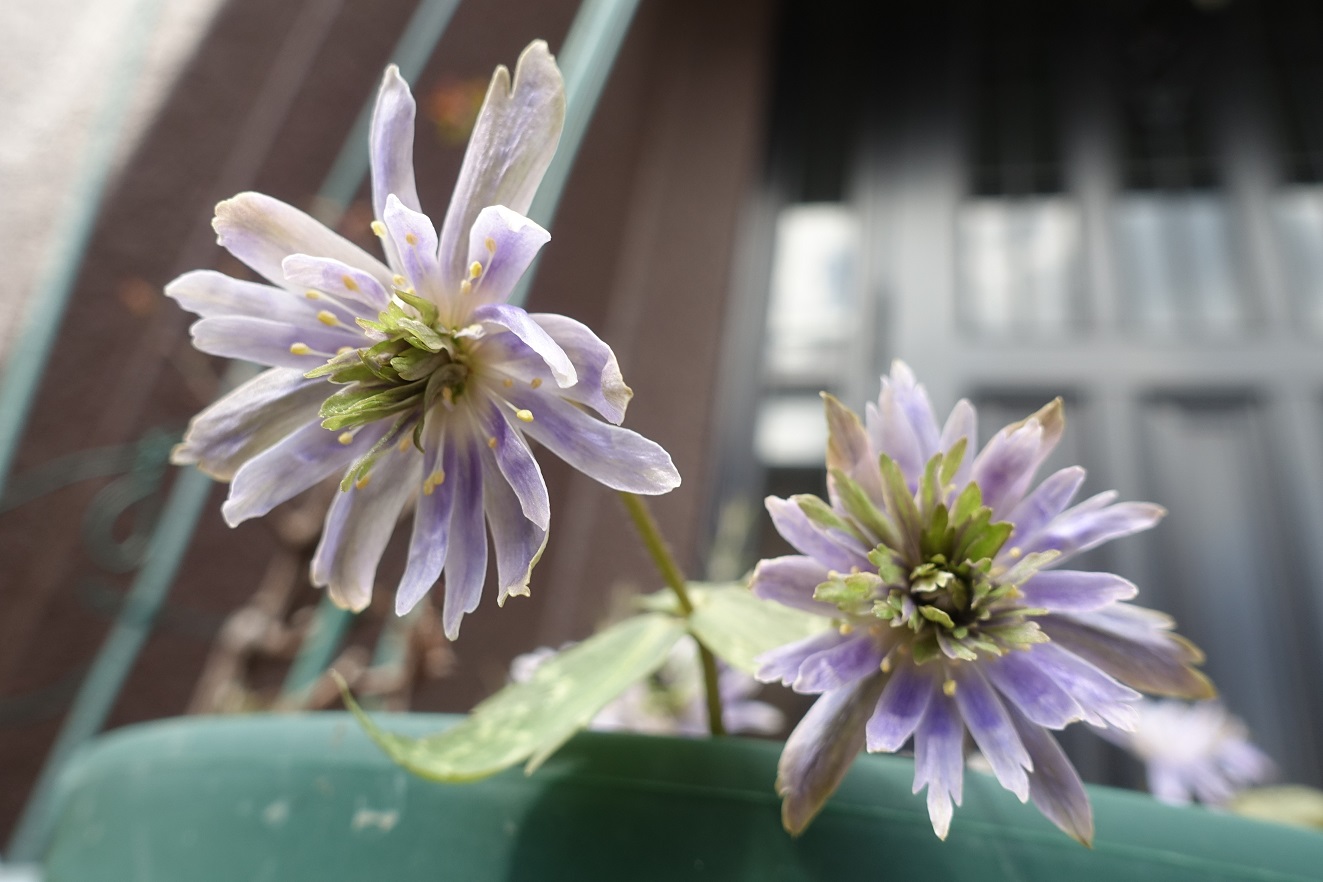これまでに我家の庭で咲いた、ユキワリイチゲの3段花を紹介します。一口にユキワリイチゲの3段花と言っても、同じ株でもその年によって咲き方が変化します。 理由ははっきりしませんが、前年に立派な大きい変化に富んだ花が咲いた株は、翌年にはあまり立派な3段花にはならないケースがあります。 推測ですが、前年に栄養分を使い過ぎてしまい今年、立派な花を咲かせる事が出来なかったのでは……。 大きな花が咲きました。差し渡し80mm程あります。最外側のがく片が異常に伸びています。 3段花は大きく重いため自分で支えられない場合があります。そのために竹串を添え、テープを巻き支えています。 咲き始めて20日目、咲き始めは雄しべより短かった最内側の花弁(萼片)が外側の花弁に負けないほど伸びて来ました。 花弁の色も濃いモスグリーンから明るいグリーンに変化し、最終的には瑠璃色に変わります。 同じ3段花の血を持った株ですが、右側は3段花になり左側の花は通常花で咲いています。3段花にならない株は冒頭でも述べたように、栄養不足ではないかと想像します。 アンバランスに咲いた3段花です。上下2枚の花弁(萼片)だけ異常に伸び咲いています。3段花の特徴の一つとして最外側の花弁が異常に伸びる事が良くあります。 この花で差し渡し75mm程ですが、開花してまだ1週間ほどですので、まだまだ伸びると思います。 開花したての3段花。この花は前写真の花と違い、外側のモスグリーンの花弁が無く通常の端正な花姿で咲いています。内側の濃いモスグリーンの花弁が無ければ3段花とは思えません。 内側の濃いモスグリーンの花弁は、内側から瑠璃色に変化しはじめています。 開花が進んで、濃かった内側の濃いモスグリーンの花弁が、かなり瑠璃色に変化してきました。 開花して左が20日め、右側が1週間。3段あるそれぞれの花弁の伸び方の違いがよく判ります。 比較的バランス良く開花した3段花。開花後10日目の花姿。 前写真の花から更に10日後、(開花から20日)内側の花弁が伸びてピークを迎えました。見事な3段花です。 アップ写真 前写真から更に5日(開花から25日)少し勢いが無くなってきました。 前写真から更に10日後(開花から35に日)花色は薄くなってきましたが、まだまだ元気! ユキワリイチゲの3段花は長寿です。気候、気温にもよりますが、通常花で約3週間程、3段花は35日~40日間とかなり長寿です。 考えられるのは、「雄しべが変異し、花弁に変化した最内側の花弁が、成長を続けるため、栄養供給が続くためではないかと推測します。」 この3段花は、開花時点で最内側の花弁の色は瑠璃色になっています。 この3段花は、一茎2輪咲きになり損ねたようです。最内側のモスグリーンの花弁が2個くっ付いたように横長になっています。変異の多いユキワリイチゲでは時々発生します。 ユキワリイチゲの3段花の特徴の一つとして、花弁の縁に切れ込みが多く入る斑切れ弁になる事です。 ユキワリイチゲとは思えない花姿です。 ユキワリイチゲの3段花を発見して14年程になります。同じ株でも、咲く花に毎年変化があるため楽しみがあります。 今年はどんな花姿で咲くだろう?、来年はもっと凄い花を咲かせたい!楽しみは尽きません。 今日はこの辺で。