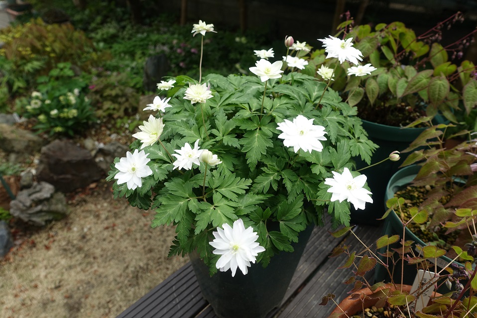 昨日から昨夜にかけ、時折り雪が舞い、強い北風が吹く荒れた一日でした! 咲き始めた庭の花達も、縮み凍えています。 昨秋に、球根(20個程)を植えたアネモネ フルゲンスが咲き出しました。 (写真は一昨日に写したものです) 玄関先の植え込みに、バラ2株(伊豆の踊子・ガートルードジェキル)、ユキワリイチゲ、クリスマスローズ、イカリソウ等と一緒に植えています。 遅れていたユキワリイチゲも今が見頃です。 バラ用の長鉢に植えてる八重咲イチリンソウの葉が繁って来ました。 蕾も幾つか上がっています。この月末には開花しそうです。 昨年(2023年)咲いた八重咲イチリンソウです(上写真の鉢)。花弁にほんのり紅を差し、豪華なイチリンソウです! 注)この八重咲のイチリンソウは、純粋な国産です。洋種の八重咲イチリンソウとは全く別物です。 洋種の八重咲イチリンソウ 花の形、花の大きさ、葉の形状とかなり異なります。 4年前の2021年、山野草の自生地巡りをしていて偶然に発見したものです。 イチリンソウの多弁花発見 根茎数本を持ち帰り、鉢で栽培を続けたものです。結果、翌年には見事な八重咲の花が咲き、2022年に咲いた八重咲イチリンソウ現在に至っています。 花弁数は30枚~40枚ほどにもなり、見事な八重咲になります。 写真は、通常の日本産イチリンソウです。通常、花弁は5弁で咲き、稀に6~8弁の花も散見されます。 花弁数が多いため重たいのか、真っすぐ正面は向けない。 山野草の自生地巡り、季節ごとに数回づつ出かけますが、注意深く観察を続けていると、素晴らしい出会いが待っています。 10数年前に花友と発見したユキワリイチゲの3段花に続く大発見でした。 3寒4温とはよく言ったものでまさに、この頃の天気は気まぐれです。しかしあと1週間ほどすれば4月、桜の季節はもう目の前です! 今日はこの辺で。