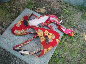 破壊活動を継続中『犬小屋』だけで飽き足らず、まだまだやってます 『スリッパ』です 『日傘 & ウッドデッキ』です 『洗濯バサミ』です 何が彼を掻き立てるのか・・・ 特に家族全員で出かけたときに物に当たるみたいです 『オレを置いてきやがったな 』ってかでは