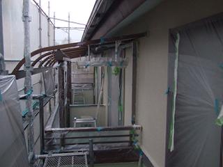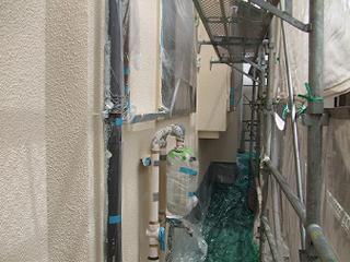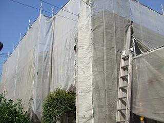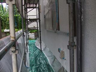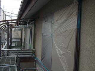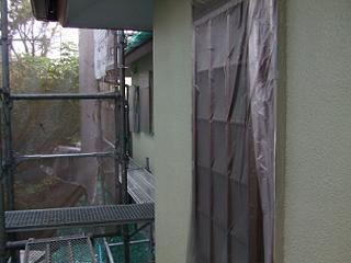今日は土曜日に引き続き、養生から。まずはベランダ面。ベランダの下。そして西面です。全ての養生が終わったので、続いては外壁の下塗りです。ベランダ面。ベランダ下。そして西面です。明日は外壁下塗りの続きです。