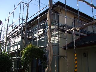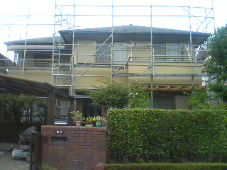 いよいよ今日から塗装工事が始まりました。と言っても私は前日から仕事してましたが(笑)。その仕事とは「ご近所さまへの挨拶」です。ご不在の場合も多いので、チラシを作っての挨拶回り。個人的にはこの日は特に緊張します(笑)。そして今日は仮設足場の組立です。朝から始めて、夕方にはこの通り。明日はメッシュシートを張った後、高圧洗浄をします。