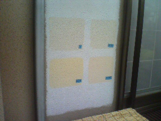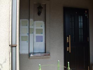 カラーシュミレーションで大体のイメージを掴んでいただいた後は、今度は実際に色を塗ってみます。私がお客様の目の前で色を作り、実際の家に塗って色を見てもらうのです。実際の家に塗りますので細かいイメージが掴みやすく、「もう少し黄色」とか「もうちょっと赤」など言ってもらえれば何色でも作ります(笑)。家の正面側にサンプルで塗りました。そしてさらに家の裏側にも同じようにサンプルを塗ります。これは以前お客様に言っていただいた事なんですが、「正面だけだと色が判りにくい場合もある。裏側にも塗ってあればもっと判りやすいのに。」と言う声から始めてみました。これでサンプル作りは終わりです。この後はじっくりと時間をかけて色を選んでもらいます。今回は弊社の都合に合わせて、急いで色を選んでもらってしまいました。S様。ありがとうございました。