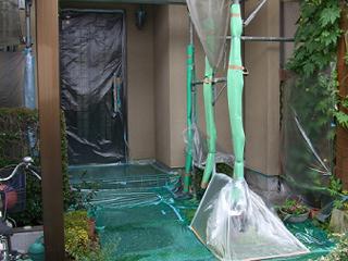 今日は前日に引き続き養生。終わるとこんな感じです。玄関前建物右側 裏側 下屋根 どうしても歩いてしまう庭も養生します。 これで養生は全て終わりです。引き続き、今度は外壁の下塗りです。時間的に余裕がなかったので、裏側だけ塗りました。 明日は外壁下塗りの続きです。
