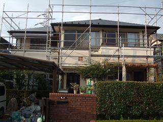 いよいよ本日よりM様邸の塗装工事がスタートしました。施工前の写真です。 裏側です。 そして足場が組みあがった状態です。 裏側です。 出来上がったばかりの足場で屋根に上ってみました。やはりコケが酷いのが解ります。 屋根の一部にはこんなものが。明日はメッシュシートを張った後に、高圧洗浄をします。