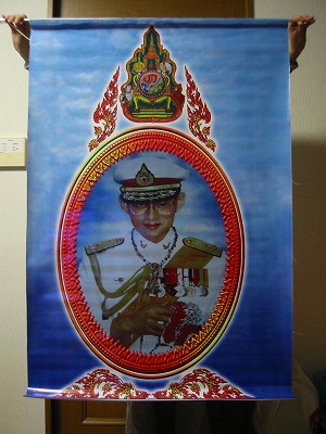タイで買ってきた 王様の掛け軸と 王様の旗です。横の長さポールを含めて1.5メートル位ありました。あまり長いのでこんなんじゃ 機内にも持ち込み出来ないと思ってましたが・・・・・・タイの空港でのやり取りです。JALタイの方「これ なんですか?」私「王様の 掛け軸と お旗です 」JALタイの方「・・・・・」私「機内に持ち込んでいいですか?」JALタイの方「え~ 長さが・・・・」私「えっ あなた まさか 王様をカーゴにお入れしちゃうんですか? メダ~イ メダ~イ(だめ だめ)王様ですよ。」JALタイの方「ですよね~ どうぞ 機内に。 客室乗務員に申しつけておきます」やっぱり タイでは王様 敬われていますね。でも 衝動買いです。どこに 飾ったら良いでしょう・・・・・・