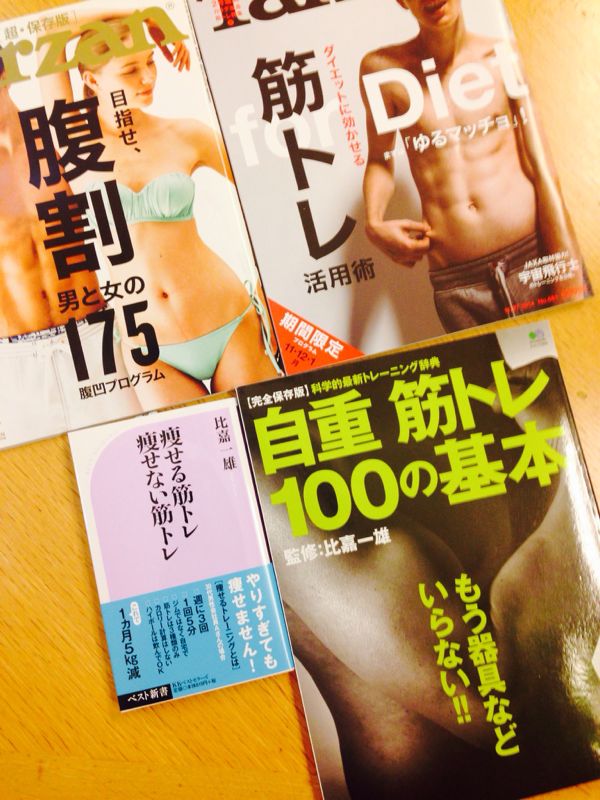 最近の私の愛読書。もはやバイブルですw下の二冊は比嘉一雄という方の著書。筋トレ界では有名なのかしら?東京大学大学院に在学中の方らしいです。説得力のある分かりやすい文章です。特に「痩せる筋トレ痩せない筋トレ」の冒頭にある『失敗とは成功の前にやめること』という言葉には感嘆しました。それからダイエットという言葉ではなくボディメイクという言葉もいいなぁと。ダイエットっていうと何かを制限したりマイナスのイメージがありますものね。ボディメイクって響き、いいじゃないですかーなりたい理想の身体をつくるんですよ。前向きじゃないですかっまさに今の私は体重を落とすことより、締まった美しい身体を作りたいと思ってるわけなので。食べ物にも気を配るようになりましたね。カロリーを気にするというのではなく、何を食べたらよりよい身体を作れるかという事を考えるようになりました。私は夢中になるととことん一生懸命になっちゃうので(良くも悪くも)食べたいスイーツは食べ、飲みたいお酒も飲んでストイックになりすぎないようにしてます。スタジオレッスンも筋トレももう少し出来そうだなーと感じても、蘭丸の散歩と夕飯準備にための余力は残しておいてます。無理をしすぎない事が長続きの秘訣だと思うので。全然リズムに乗れなかったエアロも、あれっ、私今日すごく乗れてるじゃんって時もあってすごい充実感というか達成感があります頑張ってるねーって声かけられた事はあるけど、上手ですねって言われた事はないのでいつか言われてみたいなーTarzanの最新号はコチラですね。私は自分の読みたい内容のバッグナンバーを取り寄せしました。筋トレマニアにはもう定石みたいな言葉でも私には新鮮っ今年の目標はズバリ、『アブをカットする』です。あははははw ちょっとマニアっぽく言ってみました。