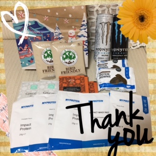 今日はジムでデッドリフトを。50kg×10を3セット、55kg×10を3セット。トップサイドで70kg×10回。ケーブルで背中もやってからスタジオレッスン。終わってからフリーウェイト行ったら熊がちょっとって手招きしてコレくれた。こないだプロテイン何飲んでるの?とかって話したからサンプルだけどあげるって。後は自分が飲んでるモンスターとかプロテインバーとかお茶とか。可愛い紙袋に入っててなんか少し早いクリスマスプレゼントみたいで嬉しかった
