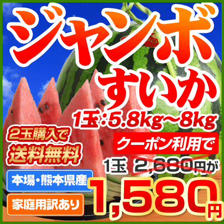 そう、私はわけあり大好き! だってたなおちすいか大好きなんですもーん(^o^)v 【クーポン利用で1,100円OFF!】スイカ日本一の産地・熊本産ジャンボすいか1玉(約5.8~8kg)!甘くてみずみずしい♪【2玉購入で送料無料】【訳あり品】※1玉購入の場合は送料が別途必要となります。
