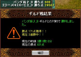 1/23(月)本日の参加BIS2,弓1,悪魔2 ・・・WIZ寝坊 の5名wお相手は1.5~2PT弱ほど。火力が多めの構成でした。WIZなしでこの人数差・・・まずやることはひとつ! 奇襲w開始直後、支援かけてる最中の相手陣内に突っ込み2~3人ほど倒し先制!こちらも一人倒されるも一旦引いてまずは奇襲成功。リードしている間は相手から向かってきてくれたので、ちょいちょいコルでタゲはずしながらなんとか戦えていました、が途中、逆転されてしまってからは相手がどっしり陣を構えて立場が逆転><2PTに5人で突っ込まなければならない状況に。けん制しようとちょっと前に出たら罠指からのフルボッコくらうボケGMがいたり(まじすまんw)点差離されて( _。д゜)アウアウアー 打つ手なしかーと思ったんですが終了約2分前、裏からの蟻で相手TOP?弓を倒し僅かな点差で逆転wwwこのときみんなの意思がひとつになったと思います。にげろーーーーーーーーーーーwwwwwwwwwwwwwwwww残り1分ちょい、なんとか逃げ切って勝利できました^^最後に倒せたのが高LVさんでよかったw1/25(水)本日の参加人数 8人!BIS2,WIZ2,弓2,悪魔2現在のJOKERで考えられる最多人数w ベストメンバー!お相手も1PT程。黄鯖といえば、今まで一度も勝っていない鯖だったと思います。毎回速い天使に翻弄され、痛い遠距離火力に倒されてきました><本日のお相手も速い天使&火力は弓とシフでした。黄鯖さんはこういうスタイルのGが多いようですね~。序盤先制されるも、すぐに逆転できたのが良かったと思います!相手がリードした状態で速い天使に引き気味に戦われるときびしいからな~。タゲ決めて裏から点も取れましたし、裏が入らなくなったらWIZ烈火でちょいちょい点とれたのがよかった。BIS2,WIZ2で守りも良く、安定した戦ができたと思います^^
