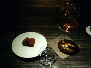その後、気分を変えて小洒落たシャンパン&シガーBARというのに行った。シャンパンもシガーも注文せず、「ボウモア+オリジナル生チョコ」という大人向けのスウィーツのセットみたいなのがあったのでこれを頼む。オリジナルの生チョコは、ラフロイグを練りこんであるという。むむむこれは良い。