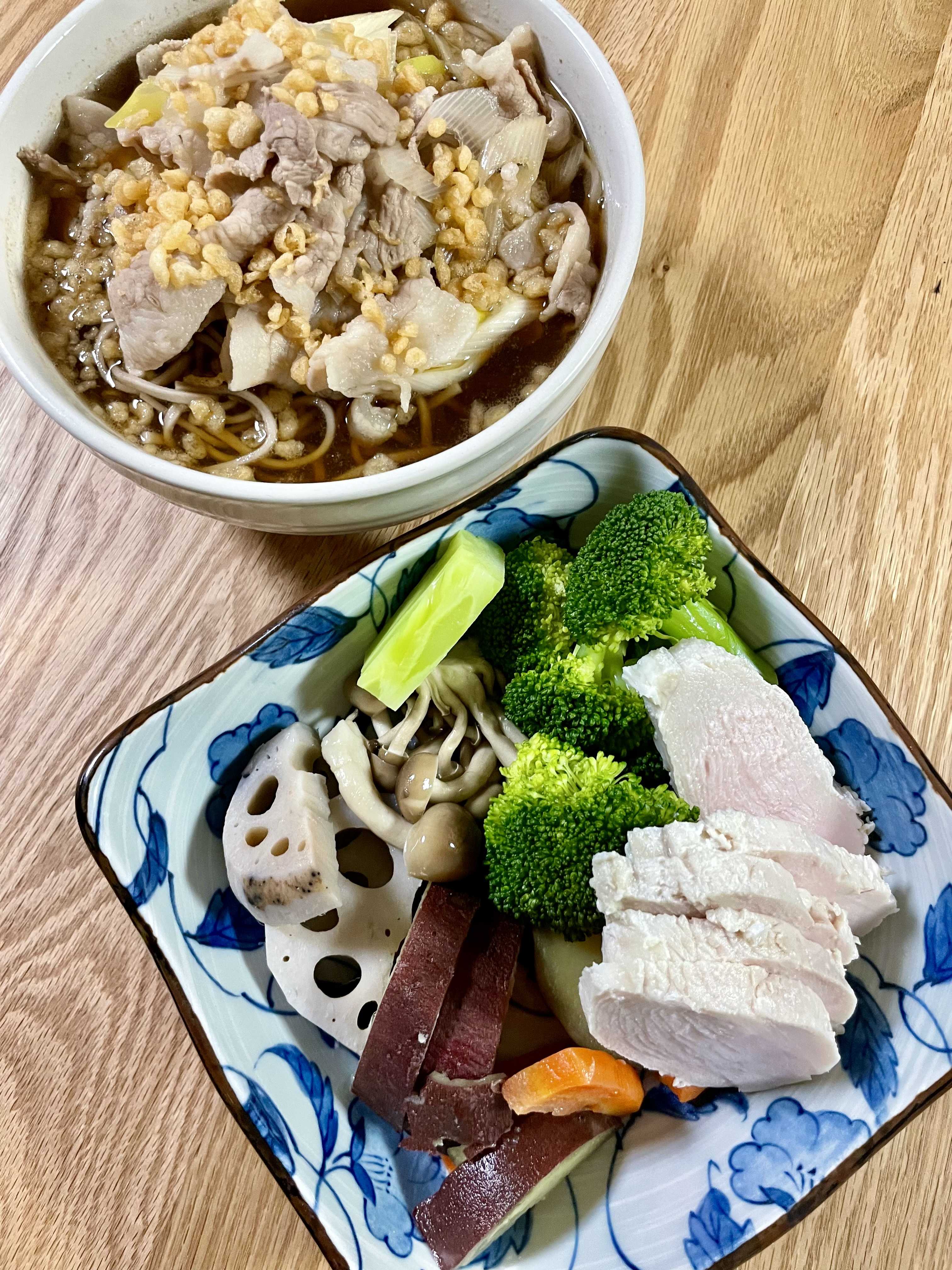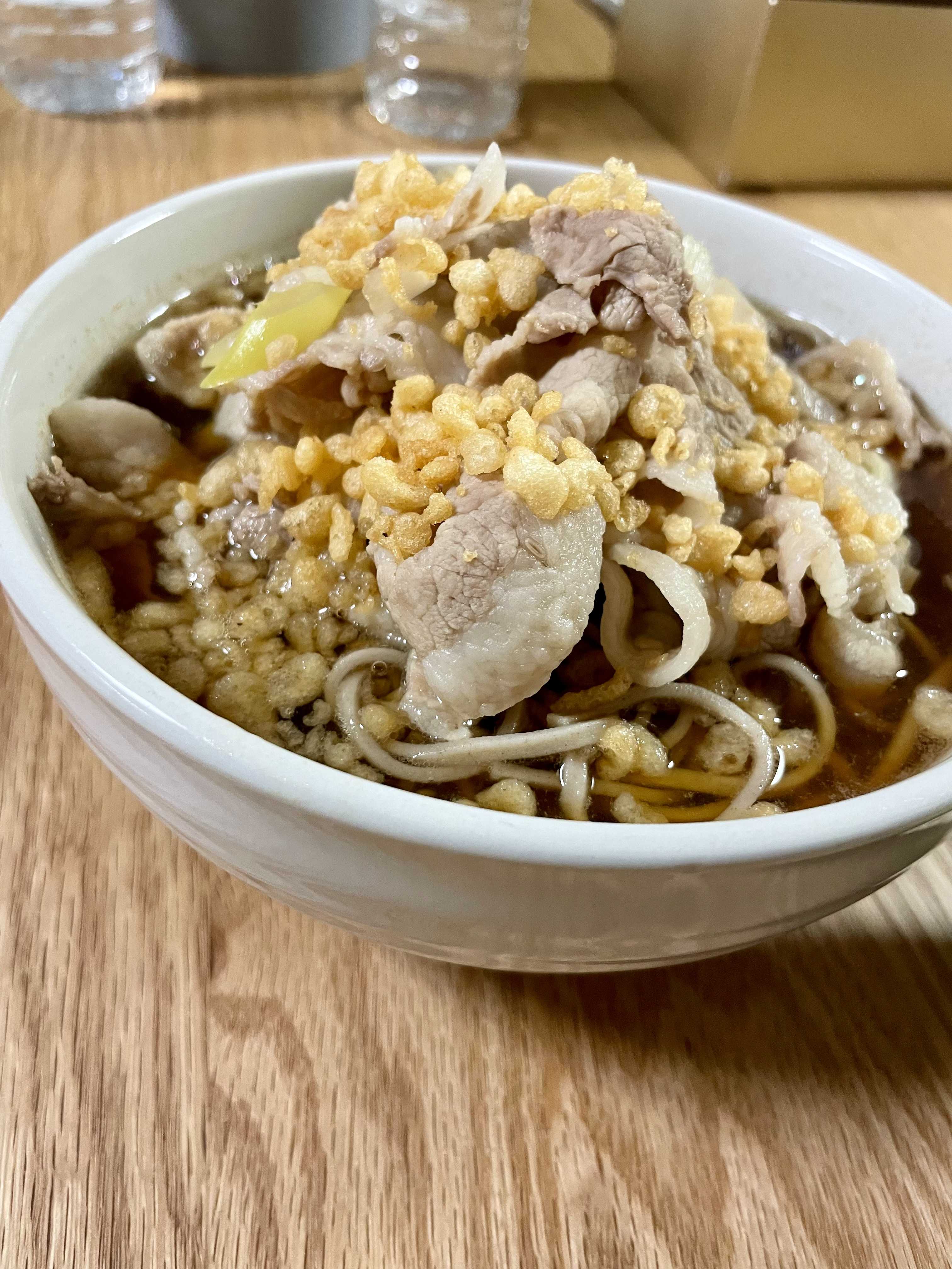 息子には豚バラたっぷりのお蕎麦!