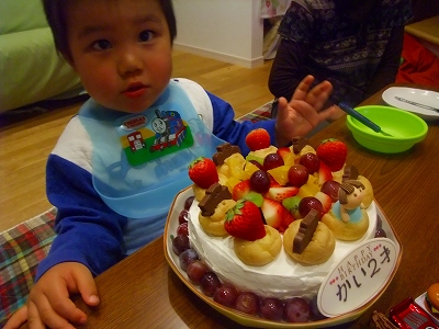 おめでと~ママの手作りケーキでお祝いしました。櫂の好きな、いちごとぶどうにカーズのチョコをトッピングしたスペシャルケーキここ1週間くらいケーキのデザインが決まらず色々考えてましたが、櫂の喜ぶ顔を想像しながらイメージを膨らませて・・・^^そんな時間も心地よかったです。プレゼントは、お庭で使うパラソル付きベンチテーブルとトミカ、靴、服、ハンドタオル・・・夕飯はグラタンとやきとり、スープに新玉ねぎのサラダ櫂の好きなもの尽くしのお誕生日、ロウソクの火が消せなかったけどバーバ達に手伝ってもらって一緒に消したね。ここ数日で言葉が一気に増えて、”また行きたい。”とか、”楽しかった。”とか写真撮る時に”ピース”って言いながら決めポーズ!悪戯もイヤイヤも激しくなって来たけど、日々成長してる息子の姿に感動の毎日だよ。ママとパパのところに来てくれて本当にありがとう。