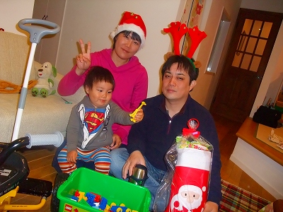 我が家のクリスマス日記だいぶ遅れてますが・・・櫂のところにもサンタさんがきましたよ!^^枕元にも憧れますが、子供が起きてる時間にが届けば、喜ぶ姿が一緒に見れると言う事で、今年もピンポーン!と、玄関から登場!(笑)沢山あるプレゼントの中から目に付いたものから手に取り、部屋に運び・・・これを数回繰り返して、包装紙を破り、玩具の登場!もう目がキラキラ輝いて大興奮の櫂ちゃんですが、そんな姿を見る親も大興奮(笑)櫂のところに届いたプレゼントは、LEGOブロックの楽しい動物園と三輪車、お菓子がいっぱい入った長靴でした。(お父さんみたいに、物作りが好きになって欲しいとの気持ちを込めて・・・^^)夢中で!夢中で!これ以上の言葉が見つからないくらい夢中で、幸せな時間に感謝のクリスマスでした。メデタシ!メデタシ!