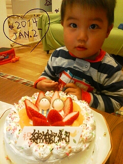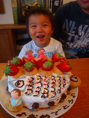 ママの手作りケーキをみんなで食べました。最近の流行言葉は、パパ!ママ!です。(笑)パパ、ママ、かい、これからも家族仲良く暮らして行こうね。