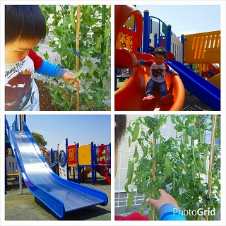 今日は2歳児健診はみがき教室に!身長88cm、体重14kgやや肥満気味でした。牛乳をジュースと勘違いしてる櫂さんは1日1500mlくらい飲むので、少し控えたいと思います。寝際に歯を磨くのですが、磨いた後に牛乳を飲んでしまう事もあるので相談してきました。牛乳飲んだら”歯磨きもう1回!”根気よくやって行くしかないと・・・大変ですが虫歯になってから歯医者行くのはもっと大変なので頑張るしかないですね。アンパンマンの歯磨き紙芝居を聞き、少しは歯磨きの大切さをわかってくれたかな?帰りにパワーアップした大覚寺公園で遊んできました。沢山ある滑り台の中で気に入った滑り台を見つけた櫂ちゃんは何度も繰り返して遊び、とっても嬉しそう。大きな滑り台はママと一緒に並んで”ヨ~イドン!”の掛け声でシューッ!と滑りご満悦の様子帰宅後、家庭菜園で育ててるグリーンピースのチェック、こちらもスクスク成長してました。