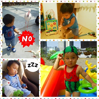久しぶりの更新!スマホ依存?PCを開く機会が激減してしまい、日記の更新も疎かになってしまいました。1歳3ヶ月飛び越し、1歳4ヶ月になった櫂ちゃんの成長記録階段上れるようになり、寝室に行く時はラクされてもらってます。^^朝は自分で階段途中までバックで下りて、途中から抱っこ!上手に歩く?時には走れるまでに・・・木馬にまたぎ自分で遊べるようになりました。カワイイ言葉の発達は、”ワンワン(いた)””行っちゃった。””マンマ””あ”から進みませんが、ワンワンいた。と2語言えるところがすごいっ!うにゃうにゃ何かを話してるようだか、何を言ってるかは???大きなプールを買い、夢だったお庭でのプール遊びが実現!(←これは私)音楽が流れるとリズムを取れるようになってきた。(トーマス、いないいないばぁ)意思表示がしっかり、泣いたり笑ったり怒ったり・・・子供らしく益々可愛くなってきたよ。歯磨き苦戦中~
