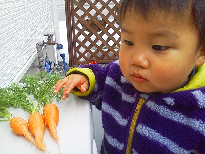 櫂、大好物の人参デザート感覚でもりもり食べます。(笑)離乳食の時から人参大好きだったので、家庭菜園で人参に初挑戦してみました。種蒔き時期が悪かったのか、日当たりが悪かったのか・・・じっくり時間をかけて育てた人参ちゃんを試しに3本掘り出してみました。櫂ちゃんサイズで可愛い。ちびっ子だけど色も綺麗だし見た目はめっちゃ美味しそうだね。