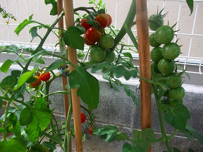 順調ですっ!昨年は良いところで台風の被害に遭い終了してしまいましたが、今のところ大丈夫!毎日収穫が楽しめるので、プール遊びの途中で水分補給を兼ねパクパク食べてるよ。櫂の口の中で弾けた汁が顔に飛ぶと言う落ちはありますが、最近交わせるようになってきました。(笑)完熟でめちゃくちゃ美味しいトマトちゃん。自然の恵みに感謝だね!