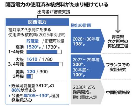 青森県六ヶ所村に建設中の「原子燃料サイクル施設」は、一通りの工事が終わって安全性の確認が終われば完成するはずだったのが、今から28年前のことだったが、28年前からこの「施設」は繰り返して原子力規制委員会の検査を受けているのに、毎回「不合格」を繰り返してついに28年過ぎてしまったという、いわく付きの「施設」で、この施設が竣工しないために一番困っているのが関西電力で、次回の検査では必ず「合格」を獲得するために、企業の枠を越えて、六ヶ所村の施設に精鋭の社員を派遣することになったと、14日の朝日新聞が報道している; 青森県北東部の六ケ所村にある日本原燃の「原子燃料サイクル施設」。日本各地の原子力発電所で使われた核燃料を運び、再利用できるウランとプルトニウムを取り出す「再処理工場」があり、政府が進める核燃料サイクルの中核となる施設だ。 5月末、甲子園球場約195個分の広いその敷地を訪れると、建屋が整然と並び、関係会社の大小さまざまな工事車両が行き交っていた。敷地内では約1万人が働く。 関西電力は2024年7月、社内で「エース級」と言われる18人をここへ送り込んだ。遠く離れた青森の施設に関電が入れ込むのは、再処理工場を目標である26年度中に稼働させたいから。1997年に完成するはずだった再処理工場は、延期を27回も繰り返している。 さらなる延期となれば、原発を根幹に置く関電の経営を左右しかねない。「ここが動かないと、一番困るのはうちだから。『自社の工場と思って対応する』と言われている」(関電社員) 関電は福井県内に美浜、大飯、高浜の3原発を持つ。核燃料を保管する3原発の燃料プールは、25年3月末時点で88%が埋まる。このままため続けた場合、28年度末ごろには燃料プールが満杯になる計算だ。 地元の福井県からは、使用済み核燃料を県外に運び出すように求められている。関電の現在の計画では搬出先は3カ所あり、このうち本命は六ケ所村だ。28年度から再処理工場に運び出し、30年度までに198トンを出すとする。 関電からの出向者たちの多くは、原燃のてこ入れに送られた。原燃が23年に立ち上げた特別チームに入るなどして、原子力規制委員会による工場の安全性などの審査実務で中心を担う。 「結局すべてゼネコン、メーカー任せ。自分たちで設計図すら描けない」「お作法を知らない」。規制委からの質問に十分に答えられず、姿勢さえ問われてきた原燃の審査の矢面に、関電の技術者らが立つようになった。 規制委の関係者からは「関電のエース級だから審査対応をわかっている。原燃が10回説明するよりも、この人たちが30分説明した方が話が前に進む」との声も。原燃の担当者も、26年度に工場が動く可能性は「確度がある」と期待する。 それでも、計画通りに工場が動くかはまだ見通せない。今年4月の規制委のヒアリングでは「もう全然説明になっていない」「次の竣工(しゅんこう)も遅らせようと考えているのか」と不満の声もあった。 仮に動いたとしても、関電が新たに運び込める使用済み核燃料は年54~78トン。原発から毎年出る105~130トンほどには計算上、及ばない。 残りをどうするか。関電が国内のもう一つの搬出先とするのが、中間貯蔵施設の建設構想がある山口県上関町だ。(野口陽、小川裕介) ◇ 美浜で原発の新設に動き出した関電には、東京電力福島第一原発の事故前から長く未解決の使用済み核燃料の問題がある。何が課題なのか。2回で記す。2025年8月14日 朝日新聞朝刊 13版S 7ページ 「(けいざい+)使用済み核燃料と関電」から「上・エース級18人、『本命』へ投入」を引用 この記事を普通に読み流すと、まるで日本原燃の社員はやる気がないけど関西電力の精鋭社員を派遣して、原子力規制委の鋭い質問にも誠意を持って対応すれば、きっと「検査合格」を勝ち取ることができる、というような筋書きのようにも読めますが、現実の世界はそんなに単純なものではないと思います。過去28年間も「不合格」とされてきた真の原因は、「原子燃料サイクル施設」の発想そのものに、原理的な「無理」が存在するから、何度がんばって見ても「合格」点をもらえなかった、というのが「実態」なのではないか、私はそう思います。第一、世界中で「原子燃料サイクル施設」を実現している国はないのだという「現実」を、私たちは重視するべきで、アメリカもイギリスも、そんなものは無理だんだからやらない、と言ってるのに、日本だけは、原発を止められると困る電力資本に配慮して、いつまでも「今度こそは」と希望の灯火を絶やさないように頑張っている。そういう無理も、いつまでも続けていて良いとは、到底思えません。