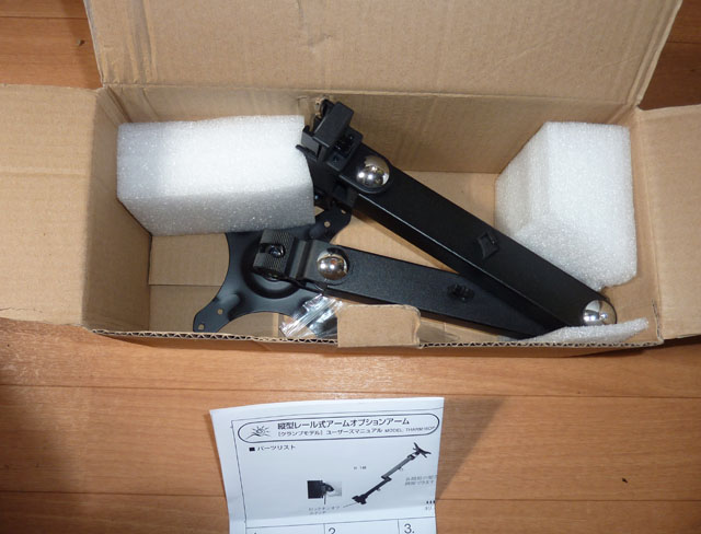 4モニタ用アームTHARM16S3にはまだ2台しかモニタを取り付けていなかったので、またBenQのモニタを一台購入して取り付けました。ひさしぶりにTHARM16S3の価格を検索してみると11,426円/送料込/ポイント10倍値段の変動は結構あるようです。 まだ箱をあけていなかったTHARM16S3の付属アームは次のようなものです。