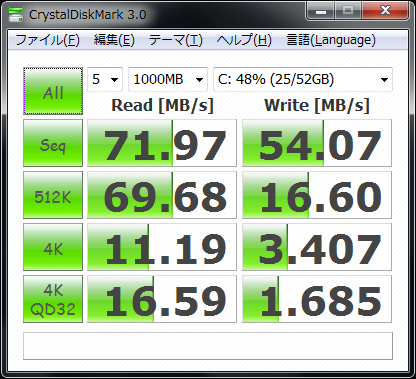 前回 VAIO Type P のベンチマーク結果をCrystalMark 2004R3で調べました。CPU・SSDともそんなに速くないといった結果になっているのですが、後から他の人のベンチマーク結果を探してみると、SSD(HDD)の測定結果が自分のマシンよりもよい結果がでている記事を何件か見つかりました。そこでとりあえず Windows Updateをしなおして、再起動した状態でまずハードディスクのベンチマーク CrystalDiskMarkの結果も測定することにします。ためしにバッテリー駆動時の値も測定しています。どうもSSDではWriteの値がばらつくようで、5回の測定中かなり大きく変化しています。Writeの値は消去等が発生するかどうかといった以前のファイル状態に依存する影響が大きいので、あまり細かい数字をどうこういってもしょうがなさそうです。リードに関してはAC動作時のほうが若干良い結果がでているようにみえます。次にCrystalMark 2004R3も再測定してみます。ついでにバッテリー駆動時も測定して見ます。ところが一回目の測定中D2Dの測定最中にフリーズしてしまいました。強制オフし再充電後、気を取り直して再測定。今度は満充電後のテストのせいか、最後まで測定できました。ベンチマークテストのような負荷の高いテストはバッテリー駆動時はさけておいたほうがよさそうです。HDD(SSD)のテストでは、テストしているサイズが大きいせいかCrystalDiskMarkのほうが良い結果がでるようです。シーケンシャルリードが70MB/s以上、シーケンシャルライトが50MB/s以上。バッテリー駆動時は1割程度の速度低下といった感じです。結構いい値がでているなあと思って、いろいろ記事を検索してみるとどうもリードの値がもっといい記事を見つけました。VAIOの場合、CPUの周波数等コンフィグレーションが変更できるので、比較は難しいのですが、どうも128GBのSSDのほうが速い結果がでているように見えます。といっても差は小さく、速度が2倍かわるといったようなHDD/SSD間の差ほどはないので、あまり気にしなくてよさそうです。けれどもベンチマーク結果にどうしてもこだわるような人の場合はチップの並列度が増して速度が高速化している可能性の高い、大容量モデルを購入したほうがよさそうです。当然のことながらそういった場合は店頭モデルではなく、Sony Styleでカスタマイズして購入です。☆店頭モデルならソフマップ?92,800円のポイント20%VAIO Pシリーズ VPCP119KJ/W(ホワイト) WiMAX内蔵 特価 \92,800(税込) ポイント:18,560 20%還元