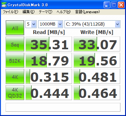 I-O DATAのUSB2.0対応外付けハードディスクがあったので、これを増設したUSB3.0と本体のUSB2.0に接続してベンチマークを測定してみました。またI-O DATAでは「マッハUSB」なる高速化ソフトウェアを提供しています。これも試してみました。☆本体 マウスコンピュータ Lm-i600X(Core i7-860) : Lm-iS601X☆USB3.0インターフェース 玄人志向 USB3.0N3-PCIe(メーカーサイト)☆ハードディスク HDC-EU1.0(メーカーサイト)まず本体の前面にあるUSB2.0コネクタに接続してベンチマークを測定してみます。次に増設したUSB3.0コネクタに接続して見ます。USB2.0側には内蔵しているカードリーダーが接続されているのですが、USB3.0側には他に何も接続されていません。このことが影響しているのかUSB3.0コネクタのほうが結果がよくなっています。次にアイオーデータのサイトからマッハUSBのソフトをダウンロードしてみます。対応商品を持っていればシリアル番号を入力するとダウンロードすることができます。ダウンロードは次のリンクから行います。ダウンロード実行すると次のような画面で有効・無効を設定できます。対応デバイスがあると設定状態として次のように表示されます。バージョン情報は次のように表示されました。MachUsbH.sysというドライバがインストールされたようです。さてマッハUSBを有効にした状態でベンチマークを測定してみます。まずは前面のUSB2.0コネクタに接続しての測定です。次は増設したUSB3.0コネクタに接続して測定します。USB2.0のハードディスクなのでUSB2.0, USB3.0のどちらのコネクタに接続しても480Mbpsで接続されることになるのですが、どちらに接続してもマッハUSBの設定は有効となっているようで、シーケンシャルアクセスであればリードが40MB/s,ライトが33MB/sに性能が向上しています。マッハUSBとして認識していないデバイスのSSDについて再測定して見ると次のように以前と変わらない結果になりました。マッハUSBはUSBデバイスのメーカーID,デバイスIDから自分の知っているデバイスについてのみ転送サイズ等を調整して転送の高速化をはかっているようです。とりあえずマッハUSBの効果は確認できました。できれば任意のデバイスを登録できるようなユーティリティなら自分で組み立てたUSB HDD等にも効果が及んでうれしいのですが、さすがにアイオーデータやバッファローはUSB HDDを売るのが商売なので、そういった対応は無理でしょう。サードパーティー等でそういうソフトは作っていないのでしょうか?1TBのUSB HDDを検索してみると検索する8000円くらいから売っているようです。今回使ったHDC-EU1.0は検索すると検索するポイントを考慮すると 9,177円ポイント10倍が一番安いようです。USB3.0のメーカー製HDDではアイオーデータHDJ-UT1.0が14,180円が一番安いようです。マッハUSBの効果が重要であれば、これを買うしかありませんが、そこまで速度は必要ないという場合であれば、内蔵SATA-HDDと外付けUSB3.0ボックスを組み合わせて購入するのが安価です。楽天のショップでもそういう組み合わせ販売をしているようです。USB3.0+ 1TB 日立GST ハードディスク 8,400円ポイント10倍なかにはちゃんとしたケースでなかったり、放熱対策がちゃんとしていない場合もあるようなので、最近の30度を越える季節では注意が必要です。とくに自分の部屋は最近35度程度まで温度が上がっているようなので、ファン付が必須でしょう。ということで裸族のインテリジェントビルUSB3.0+eSATAコンボ (CRIB35EU3)楽天の最安値は26966円(送料込)WD20EARS-00MVWB0 バルク品 (2TB/SATA)8,970円に興味を持っています。---------------------------------------------------------------------☆楽天のキャンペーン