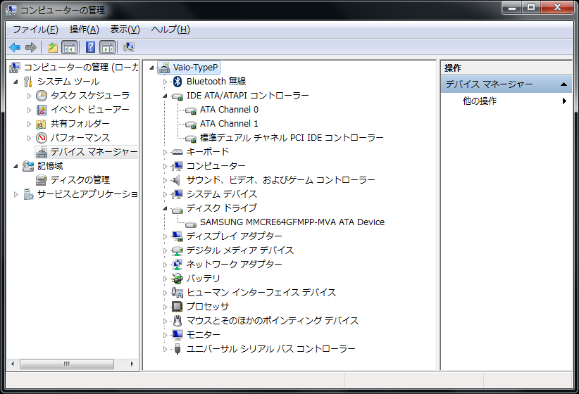 VAIO type Pに搭載されているSSDについてもう少し調べてみることにしました。自分の使っているVAIO type P(VGN-P91S)に内蔵されるSSD(64GB)はデバイスマネージャーで見ると次のように見えます。SAMSUNG MMCRE64GFMPP-MVASamsungのホームページを調べてみるとSATA 3.0Gb/s(SLC,MLC)の一覧ページにありました。Slim Type SATA 3.0Gbps(MLC) 64GB MMCRE64GFMPP-MVA QDP 8 16Gb*32InterfaceはSATA 3.0Gb/sMaximum Sequential Read Rateは90MB/sMaximum Sequential Write Rateは70MB/sVAIOの中ではSATAインターフェースをPATAインターフェースに変換しているようですが、PATAインターフェースの動作モードを調べてみると次のようになっています。Ultra DMAモード5 (wiki)最大転送速度が100MB/sのモードで動作しているので、SATA/PATA変換のオーバーヘッドはあるものの、インターフェースがネックにはならなそうです。HDDのベンチマーク結果でもシーケンシャルリードでは70MB/sは超えており、効率よく動作しているようです。PC USERの記事を見ると256GBのSSDはMMDPE56GFDXP-MVA自分のと同じ2GHzのCPUモデルでの結果のようなので、比較しやすい(結果が大きくばらつきにくい)シーケンシャルリードの値を見ると256GB SSD(MMDPE56GFDXP-MVB) 76.97MB/s128GB SSD(MMCRE28GFMXP-MVB) 73.36MB/s自分のテストでは 64GB SSD(MMCRE64GFMPP-MVA) 71.97MB/s差があるといえばあるし、ほとんど一緒といえば一緒ともいえる微妙な違いです。あらためてデータシートを探してみるとMMCRE64G8MXPMMCRE28G8MXPMMDPE56G8DXPのデータシートがみつかりました。これを見るとSequential Data Read : Up to 220MB/sSequential Data Write : Up to 175MB/s(256GB) Up to 185MB/s(128GB) Up to 120MB/s (64GB)VAIOに搭載されているデバイスと微妙に型番が異なるのですが64GBと128GB以上とではチップとの接続バス幅(同時動作チップ数)が異なりそうです。MMCRE64で検索してみるとMMCRE64G8MPP (EOL)MMCRE64G8MXP (Mass Production)MPPとMXPではデバイスの世代が異なるようで、MPPがすでに製造終了した古いモデルのようです。前の資料では MPPがRead 90MB/sということだったので、MXPで220MB/sと高速化されたように見えます。最近のデバイスはPATAの転送能力を超えるデータ転送レートになったようです。最新モデルのVAIO Type P のATAインターフェースもPATAのままのようなので、現行モデルではATAインターフェースがボトルネックとなっているようです。ということで結果的に1年前に購入した自分のType Pとそれほど変わらないベンチマークになっているはずです。うーむ…ちなみにいろいろな人のベンチマークを検索してみてみると CPUの速度でSSD(HDD)のベンチマークがかなり影響を受けているようなので、まずはCPUの速度を重視したほうがよさそうです。店長のつぶやき日記上の記事では同じ64GB SSDなのに Z530(1.6GHz)だとシーケンシャルReadが50~60MB/s程度になってます。☆店頭モデルならソフマップ?92,800円のポイント20%VAIO Pシリーズ VPCP119KJ/W(ホワイト) WiMAX内蔵 特価 \92,800(税込) ポイント:18,560 20%還元