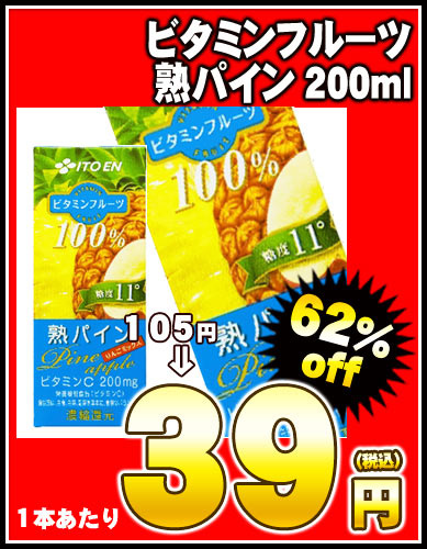 11/23に開催していた買い回りキャンペーンで、「ビタミンフルーツ熟パイン200ml紙パック」を購入しました。ITOENの100%のパインジュースがドリンク屋で1本当たり39円となにやらやたら安く感じてしまったので、購入しました。伊藤園のホームページを見ると…完熟パインにりんごを加えたビタミンCが豊富な100%果汁ミックスジュースです。と宣伝しています。パッケージは3種類あるようで・PET450g(ビタミンC300mg)・PET350g(ビタミンC250mg)・紙パック200ml(ビタミンC200mg)ビタミンCの量だけを見るとなんとなく紙パックが得なように感じてしまいます。ドリンク屋では24本で936円。送料は別に必要で、600円。同一商品のみ4ケースまで同梱可ということで悩んだ末、2ケースを注文しました。1ケースだけ購入すると送料が1本あたり25円かかることになってしまいます。そうすると商品の価格が39円なのに送料が25円とちょっと納得できない割合になります。2ケースだと送料は1本当たり12.5円。合計して1本あたり約52円。ここらへんが自分のバランス感覚的にはぎりぎりです。3ケースなら送料が1本あたり8.3円、4ケースなら6.3円と割安感は増すのですが、・12/10出荷開始・賞味期限 2011年3月1日と書かれていて、手元に届いてから2ヶ月半(80日)で全部飲むことを考えると、3ケースだと毎日1本飲むことになって、ちょっと多すぎます。家族が多くて必ず誰かが飲むというようなことであればいいのですが、あまってしまうと困ってしまいます。ということで2ケース、本体価格936x2=1872円、送料600円の合計2472円で購入しました。ちなみにドリンク屋は同じ商品が異なる価格で同時に販売されているようなので、注意が必要です。熟パインも1本あたり39円、44円、49円売り切れているものもあるのですが、そうではない場合もあるので再度検索して調べたほうがよいようです。