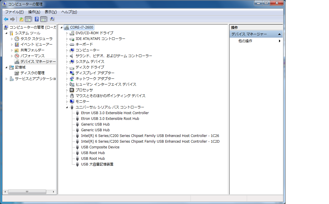 今回購入したCore i7-2600マシン(Seed Micro i52400X/DVR-W7H)にUSB3.0 HDDのCRIB35EU3を接続しようとしたところ、オンボードのUSBコントローラEtronからうまく認識できずに、USB3.0接続をいったん挫折しました。もともとCRIB35EU3はUSB3.0での接続には互換性に問題があるのか、NECのコントローラを使っていても、ルネサスドライバーを使うとうまく使えません。RENESAS製USB3.0ドライバと弊社製品の相性について(CENTURYのサポートページ)そういう意味で、 Etron製コントローラで使うのはかなり難しそうなので、PCI Express x1接続のUSB3.0インターフェースカードを接続することにしました。ほかのPCに使っていた玄人志向のUSB3.0カードを挿してみました。Windows 7 ですが、標準ではドライバは登録されておらず、ドライバをCDあるいはWebサイトからダウンロードしてインストールする必要があります。CRIB35EU3との接続問題があるので、CENTURYのサポートページからNECのドライバをダウンロードして使います。ちなみにこの問題が起こるのは・ドライブドア SATAボックス5Bay RAID USB3.0(EX35EU3R)・裸族のインテリジェントビル USB3.0(CRIB35EU3)の2機種のようです。ドライバーは問題なくインストールできました。いよいよ CRIB35EU3との接続確認です。今回 SATAの2TB HDDを追加購入して、4台内蔵できるようにしました。用意したのは・Western Digital WD20EARSが1台・SAMSUNG HD204UIが3台の合計4台です。どちらも今買おうとすれば7,000円弱で購入できますが、1台ずつ安売りのたびに追加購入しているので、半年以上前に購入したドライブもまざっています。USB3.0ケース(CRIB35EU3)に4台いれて、Clear RAID(スタンダードモード)で使い始めます。Clear RAIDモードでは4台のHDDをそれぞれ単独で認識します。上から・WD20EARS・HD204UI・HD204UI・HD204UIです。管理画面でフォーマットしていきます。フォーマットが終わって D,E,F,Gの4ドライブとして認識しています。それぞれのドライブについてベンチマークを走らせてみます。と思ったらWrite途中でエラーが発生する場合があるようです。とりあえず終わったところまでの結果をならべておきます。WD20EARSHD204UI-1HD204UI-2HD204UI-3なんか結果もばらばらです。今回ロープロファイルのPCからはずしたUSBカードを挿したのですが、ブラケットが見つからなかったので、ブラケットをはずしたままテストをしています。それが悪影響を及ぼしているのか…?気分転換に、別のUSB3.0ケースのHDDをEtronのUSB3.0バスに接続してみました。サイズのUSB3.0 HDD CASE SATA3.5にSeagate Barracuda ST3500830ASが入っています。ベンチマーク結果は次のようになりました。古いドライブなので、アクセス速度は遅いのですが、USB2.0の速度は明らかに超えており、EtronチップもCRIB35EU3と組み合わせなければ問題なく使えるようです。時間切れなので、続きはまた後にします。--------------------------------------------------------------------楽天市場で「2TB SATA HDD」を検索する(クリックすると安値を検索表示します)と…7,000円以下で購入できるものが増えています。SAMSUNG HD204UI 6,770円~WESTERN DIGITAL WD20EARS 6,980円~amazonは…Samsung SpinPoint ECO Green F4 HD204UI 3.5インチ 5,400rpm 2TB日本サムスン6,708円WesternDigital CaviarGreen 3.5inch 5400rpm 2TB 64MB SATA/3.0Gbs WD20EARSWESTERNDIGITAL7,114円普通の人はNASのほうがいいのかもしれませんNAS LS-QV2.0TL/1Dはamazonでは33,350円。BUFFALO 71.9MB/s 4ベイ搭載 高速ネットワーク対応HDD NAS 2.0TB LS-QV2.0TL/1Dバッファロー33,350円また少し安くなった!!