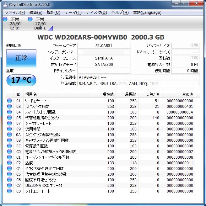 手元にはNASに組み込んだもの以外にもWD20EARSがあります。これも他と同じように・H67内蔵SATA3インターフェース・PCI Express x1 SATA3インターフェース・USB3接続のそれぞれのベンチマークを測定しようとしていたのですが…内蔵SATA3接続PCI Express x1 SATA3接続USB3.0接続リードの速度は問題なさそうなのですが、ライトの速度がなんかおかしいです。しかもどんどん悪化しているような感じがします。また低温で問題がおきてしまったのかと思い、CrystalDiskInfo で調べてみることにしました。温度は20℃を超えているので良いように見えたのですが、赤く「異常」と表示されています。リードエラーレートの項目が赤いです。代替処理済みのセクタ数代替処理保留中のセクタ数回復不可能セクタ数の3項目は黄色です。どうやらうまくアクセスできなくなりはじめたようです。中には大事なデータは入っていないので、いろいろ接続しなおしたり、電源を入れなおしたりしたのですが、良くなる雰囲気はありません。しょうがないのであきらめて翌日再挑戦しようと思っていたのですが…翌日再度ためしたところ、SMART情報が取得できませんといったエラーが発生です。認識さえできなくなりました。完全におなくなりになってしまいました。この間 10℃以下の寒い部屋で、2TB近いデータのバックアップに使ったのが悪かったのか、何がいけなかったのか…そういえばバックアップ中にライトエラーが1回出てしまった記憶があります。普通2TBのディスクをめいっぱい使い切るなんてあまりしないからなあ…SMART情報で異常が検出された後も、リードだけならできていたようなので、必要なデータが入っている場合は、すぐにバックアップをとったほうが良いようです。とりあえず、1台壊れました。-----------------------------------------------------------------HDDを使う際の注意(1) 寒い部屋では使わない(2) SMART情報で問題があるようなら、電源を入り切りする回数は最低限にして、 すぐにデータのバックアップをとる。またWriteは絶対しない(3) できれば買った直後にディスク全体に書き込みテストを行う-----------------------------------------------------------------保障されるのかなあ…?とりあえず新品の値段を検索しておきます。WD20EARS : 楽天市場では6,779円~HD204UI : 楽天市場では6,499円~ST2000DL003 : 楽天市場では6,980円~WD20EARS : amazonでは6,949円HD204UI : amazonでは6,520円ST2000DL003 : amazonでは8,452円