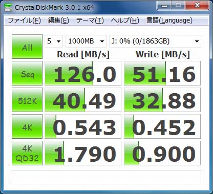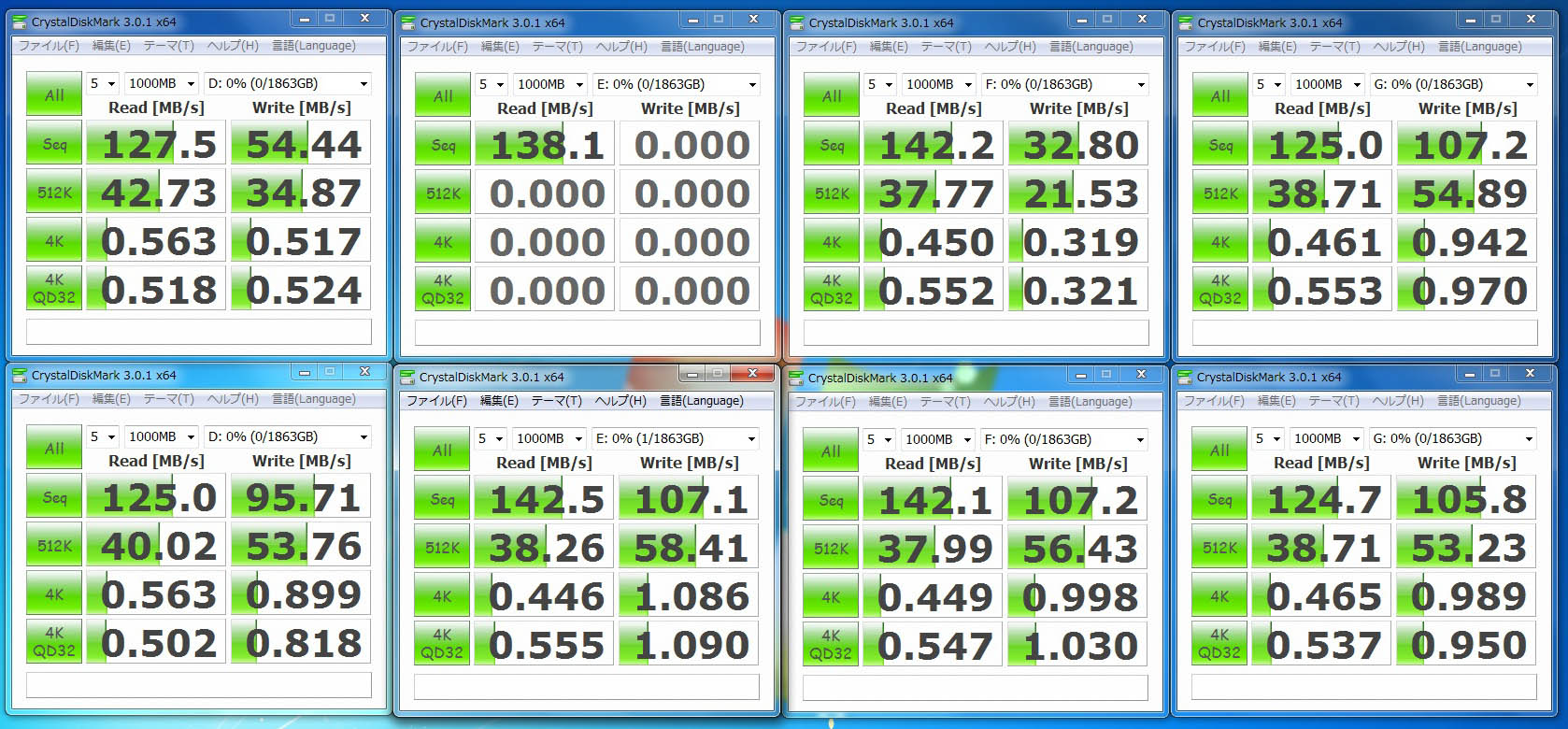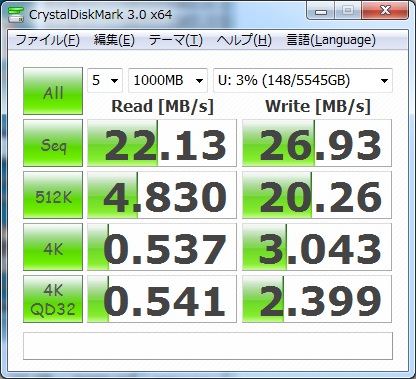 CRIB35EU3に入れた4つのドライブのベンチマークを測定すると、測定するたびに結果が変わるような気がしたので、再度実行してみました。夜中に1ドライブずつ順々に実行していきました。DドライブがWD20EARS、E,F,GドライブがHD204UIの3台です。Eドライブでまたライトでエラーが発生しました。次は翌日の昼間に再挑戦しました。今度は全ドライブエラーなしです。結果は次のとおりです。上側が夜中に実行した結果、下側が今日の昼間に再挑戦した結果です。上下に同じドライブの結果を並べています。これを見るとどうも明らかに昼間に再挑戦した結果のほうがよくなっています。WD20EARSのライトは 54MB/sから95MB/sとなっていますlHD204UIについても、Eドライブがエラーだったのがエラーが発生しなくなったことはもちろんですが、Fドライブもシーケンシャルライトが32MBZ/sだったのが107MB/sとなっています。そして昼間の結果は各ドライブ差があまりなく安定しています。夜中は部屋が10℃以下になった環境で体だけ温めながらPCを使っていたのですが、昼間は日当たりがそこそこいいので20℃程度になっています。どうも夜中の10℃以下の室温ではHDDのライトアクセスが安定しないような気がしてきました。HDDは高温は苦手だと思い、冷やすことばかり考えていましたが、10℃以下では何か問題があるのかもしれません。そう考えてみるとなんとなくこれまでのテスト結果が納得できてきます。そういえば同じドライブでも何回か測定しているとだんだん結果がよくなっていました。使っているうちにドライブや環境が暖まってHDDが安定して動作するようになったのではないでしょうか?いろいろ実験している間に、NASで問題が発生していることが発覚です。…------------------------------------------------------------------楽天市場で「2TB SATA HDD」を検索する(クリックすると安値を検索表示します)と…SAMSUNG HD204UI 6,770円~WESTERN DIGITAL WD20EARS 6,980円~amazonは…Samsung SpinPoint ECO Green F4 HD204UI 3.5インチ 5,400rpm 2TB日本サムスン6,708円WesternDigital CaviarGreen 3.5inch 5400rpm 2TB 64MB SATA/3.0Gbs WD20EARSWESTERNDIGITAL7,114円------------------------------------------------------------------2TB以上のSATA HDD一覧(http://bonbonblog.dousetsu.com/SATA-HDD.html)