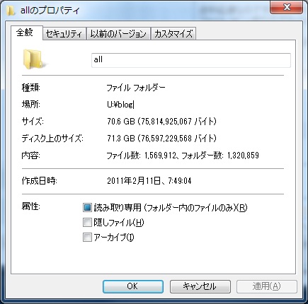 NAS LS-QV2.0TL/1Dのファームウェア発見。RAID5復活。NAS LS-QV2.0TL/1Dのベンチマークを再測定の後、作業を継続したPCのデータのコピー(移動)作業ですが、無事終了しました。今回コピーしたのは主にブログのバックアップ等の細かいテキスト・JPEGファイルが大量に入っているフォルダで、70GBと容量は少ないのですが、ファイル数は1,569,912100万フォルダ、100万ファイルを超えた、かなり数の多いファイル群です。前回はこのファイルのコピー時にPC/NASとも異常終了(?)していました。ファイル数が多いため、結局数日(3日?)かかってコピー完了です。コピーしていたPCの再起動をしたせいか、NASのファームウェアを書き直したせいか、NASの電源モードをAUTOではなくマニュアルにして、自動で電源が切られないようにしたせいか、今回は何も問題がおきませんでした。ちなみにコピーしていたのはデスクトップPCですが、自分の場合、デスクトップPCもノートPCも使わないときはスリープ状態で放置しておくために、めったに再起動しません。そのために時々リソース不足になるのか、おかしなことが起こり始めます。このブログを書いているノートPCもIEでどこにもつながらなくなったので、先ほど再起動したところです。とりあえずNASのベンチマークを再度測定してみました。シーケンシャルリードが22MB/s、シーケンシャルライトが26MB/sとRAID5の構築直後から比べると遅くなっていますが、他のNASに比べれば優秀な成績です。さてこれから、古いNASであふれそうになっている約2TBのデータのコピーを開始しようかと思います。1週間程度かかるのでは?と危惧していますが、古いNASはすでに使用率は99%。USB RAIDディスクの構築と並行して作業をはじめようと思います。-------------------------------------------------------------------LS-QV2.0TL/1Dはamazonでは32,913円で販売中LS-QV2.0TL/1D価格: ¥ 32,913 通常配送無料楽天市場でLS-QV2.0TL/1Dの安値を検索すると 35,668円あるいはポイント10倍の37,060円~2TB HDDは7,000弱で購入可能です。SAMSUNG HD204UI 楽天市場:6,600円~amazon:6,670円WESTERN DIGITAL WD20EARS楽天市場:6,779円~amazon:6,949円