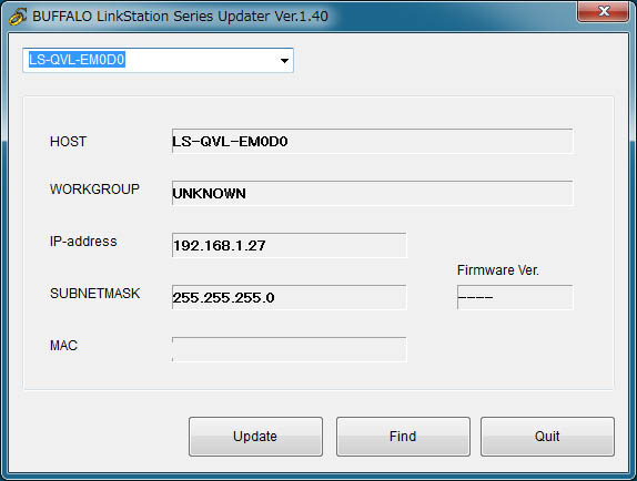 LS-QV2.0TL/1Dのファームウェアを昨日さがしたのですが、簡単には見つかりませんでした。その後も色々と探していたところ、ようやく見つかりました。一つはBUFFALOのサポートページを探し回っていれば見つかる●LinkStationシリーズ ファームウェア アップデーター Ver.1.37 (2010年10月4日掲載)Ver.1.37なので、購入したLS-QV2.0TLに入っていた1.40より古いことになります。もう一つはBUFFALOのアメリカのサイトにあるhttp://www.buffalotech.com/support/getfile/ls_series-140.zipこれがおそらく初めから入っていたバージョンと同じものと思われます。ファイル名が ls_series-137.exe と ls_series-140.zipgoogleで ls_series で検索すると見つかります。少しあやしいですが、バージョンが一致している ls_series-140.zip を解凍してみます。ファイル名サイズ hddrootfs.img224,780,548 initrd.img10,904,327linkstation_version.ini955 linkstation_version.txt198 LSUpdater.exe345,464LSUpdater.ini378u-boot.img1,085,402uImage.img4,804,410linkstation_version.txt の中身を見ると…VERSION=1.40-2.36BOOT=KERNEL=INITRD=2010/12/13 21:50:25ROOTFS=2010/12/13 21:50:02FILE_BOOT = u-boot.imgFILE_KERNEL = uImage.imgFILE_INITRD = initrd.imgFILE_ROOTFS = hddrootfs.img2010/12/13に作成されたバージョンで、1.40-2.36となっています。これを使ってみることにしました。まずはスタンバイモードになってしまう、4台のHDDに戻して電源を入れます。スタンバイモードが検出されたら、LSUpdater.exeを実行します。「Find」ボタンを押すと、スタンバイモードのLS-QVLが見つかりました。「Update」ボタンを押すと、ファームウェアの更新が開始します。Transfering と writing が交互に繰り返します。10分程度すると、書き込みが終了します。すると自動的にファームウェアの再起動が行われているようです。再起動がおわると、「LinkStation has been updated」と表示されました。ファームウェアが起動した状態で、再度「Find」ボタンを押すと…「LinkStation that needs updating wasn't found」と表示されます。スタンバイモードでないとファームウェアの書き直しはできないようです。さて書き換えが成功したのか NASNavigator2 を起動して検索します。無事見つかり、Web設定画面を開くと、RAID5のドライブがもとのとおりに見えています。やはりファームウェアがこわれたか、あるいはファームウェアの状態が不正になっていたようですが、ファームウェアの上書きをすれば復活できるようです。これで RAID5のドライブが無事復活しました。昨日作った工場出荷と同等のHDDはそのまま保存しておこうと思います。-------------------------------------------------------------------楽天市場で「2TB SATA HDD」を検索する(クリックすると安値を検索表示します)SAMSUNG HD204UI 楽天市場:6,659円~amazon:6,670円WESTERN DIGITAL WD20EARS楽天市場:6,950円~amazon:6,980円今日のamazonの価格は32,985円------------------------------------------------------------------2TB以上のSATA HDD一覧(http://bonbonblog.dousetsu.com/SATA-HDD.html)