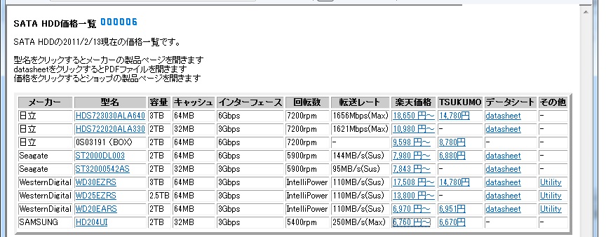 今回購入したCore i7-2600マシン(Seed Micro i52400X/DVR-W7H)にはSATA3(6Gbps)のインターフェースを搭載しています。これまでSATA3のHDDを購入したことはなかったのですが、いくらぐらいで購入できるものなのか調べてみました。2TB以上のSATA HDD一覧(http://bonbonblog.dousetsu.com/SATA-HDD.html)価格、データシート等がリンクからたどれるようにしてあります。楽天市場ではまだ高いようなのですが、TSUKUMOでは6Gbpsの2TB SATA HDD「Seagate製ST2000DL003」が6,880円で購入できるようです。SATA3(6Gbps)の2TB HDD:ST2000DL003が6,880円SATA2(3Gbps)の2TB HDD: HD204UIが6,670円SATA2(3Gbps)の2TB HDD: WD20EARSが6,951円4KBセクタながらWindows XPでも速度低下がないという記事もあるようです。「-新製品- Seagate ST2000DL003」ST2000DL003は転送レートが144MB/s(Sus)と他の2機種より高速のようで、ちょっと試したくなってきました。さて1台注文しようか検討中です。---------------------------------------------------------------------ちなみに楽天市場では 7,980円が一番安いようです。【数量限定】【Web限定特価】SEAGATE バルク内蔵HDD ST2000DL003 [2TB SATA3.0(6Gb/s) 5900rpm]価格:7,980円(税込、送料別)