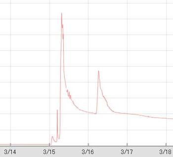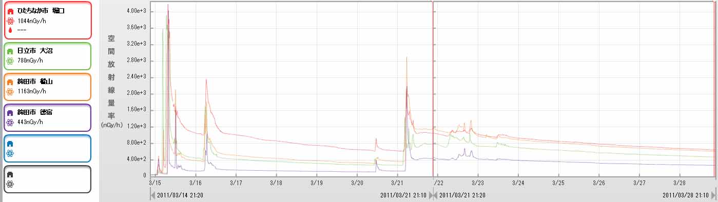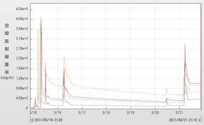 放射線の値を知ることのできる「環境防災Nネット」のホームページですが、アクセス数が増えたようで、エラー等の理由でうまく表示できない場合が増えてしまったようです。2011/3/21の21時現在の状況は、合計123万アクセス、今日のアクセス件数が3.8万。そんなにすごいアクセス件数だとは思わないのですが、おそらく原子力発電所の事故の前は、ほとんどアクセスがなくて、サーバーもそれほど多くのアクセスに対応できるようにはしていないのでしょう。最新空間放射線量率は道府県最大値北海道32nGy/h青森県27nGy/h宮城県調整中福島県調整中茨城県1140nGy/h神奈川県159nGy/h新潟県41nGy/h石川県調整中福井県・京都府77nGy/h静岡県97nGy/h大阪府67nGy/h岡山県・鳥取県36nGy/h島根県44nGy/h愛媛県25nGy/h佐賀県・長崎県36nGy/h鹿児島県43nGy/h事故のおきている福島県のデータは公表されていませんが、隣の茨城県では最大値が1100nGy/h以上と2~3日前に比べてずいぶん値が増加しています。茨城県で最大値を記録しているのは「鉾田市 樅山」で1168nGy/h。茨城県の測定ポイントの太平洋よりの南端です。原発のある東海村に近いのでもともと多い地域なのですが、基本的に太平洋側の測定値は全般的に高めになっています。茨城県の測定ポイントで一番北よりなのは「日立市 大沼」で781nGy/h。水戸市近くの「ひたちなか市 堀口」も1047nGy/hと高い値を示しています。一番南よりの「鉾田市 徳宿」は436nGy/hと少な目の値になっていますが、これらの測定値の時系列トレンドグラフは次のようになっています。ここでグラフの各色は・赤:鉾田市 樅山・緑:日立市 大沼・橙:ひたちなか市 堀口・紫:鉾田市 徳宿の測定値です。それぞれの地域で最大値の差はありますが、ほぼ同じ形をしています。3/21に雨が降り出してからこの値が上昇中です。トレンドグラフの注記として「降雨時においては、空間線量率の一時的な上昇が見られます。 これは、大気中に含まれる放射性物質が編めとともに地表に降下するためです。」と書かれています。3/21には一時的に 3/15の爆発時に近い値を計測しています。これは茨城県のデータです。http://www.bousai.ne.jp/vis/jichitai/ibaraki/index.html茨城県よりさらに南にある神奈川県では最大値が約150nGy/hです。太平洋側の測定ポイントの・川崎区浮島・川崎区千鳥・横須賀市ハイランドは皆、約150nGy/hとなっています。神奈川県でも最大値はことなりますが、似たような変化をしています。また神奈川県のほうが茨城県よりも雨の日の測定値の増加量が多いようにも見えます。今後、福島第一・第二原子力発電所の事故対策がすすんで、この値が小さくなっていくのか、注意したいところです。上のグラフでわかるように雨の日は放射線量率の測定値があがるということを聞いてしまうと、とりあえずしばらくは雨の日はちょっとした雨でも必ず傘をさしたほうがいいように感じます。これからは、携帯できるよう折りたたみ傘を持ち歩くようにしたほうがよさそうです。--------------------------------------------------------------------楽天市場で折りたたみ傘を検索(感想の多い順)24本骨傘!プレゼントにも最適なおしゃれで丈夫な雨傘(かさ)!オールグラスファイバー24本傘...価格:2,000円(税込、送料込)▲■インテリア 雑貨■あのmabuベーシックが超軽量になった!24本骨傘アンブレラが登場♪雨傘|...価格:2,625円(税込、送料込)