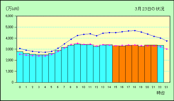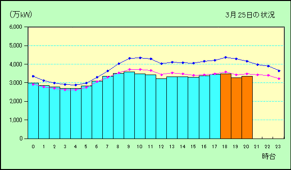 3/25の電力使用状況グラフです。3/24の電力使用状況グラフは次のようになっていました。前年の相当日が青色、前日実績がピンク色で表示されています。3/25は3/24より少し少なめでした、前年相当日を見ると、3/25の前年相当日はピークが約4,300だったのに対して、3/24の前年相当日は約4,900。どういった基準で前年相当日を決めているのかわかりませんが、似た傾向なのでしょう。電力消費量は、天気(気温)・曜日で変化するはずですが、前年の同じ時期の同じ曜日を選んでいるのでしょうか。明日からの週末(土曜、日曜)は先週と同様に計画停電の予定はありません。「3月26日(土)、27日(日)の計画停電は実施いたしません。3月28日(月)の予定は、需給動向を見極めた上で、3月27日にお知らせいたします。」週末は計画停電が実施されない傾向が強まってきたので、今週末からはそろそろいろいろな店では18:00頃までの短縮営業をやめて21:00頃まで営業するようになっているようです。業種によっては土日が稼ぎどころです。さらに飲食業等では18時以降に営業しないと、売り上げはさっぱりになってしまうのでしょう。平日でも計画実施する時間帯が限定されてくるようになってきたので、おそらく休日は平気なのでしょうが、節電は継続していないと危険です。3/26からは計画停電のグループが細分化され、5グループそれぞれがA~Eへと分けられました。グループの細分化については、最新情報は3/25の次の発表のようです。 計画停電の運用改善「グループの細分化の運用開始」について自分がどのグループなのかはグループ別対象地域詳細(PDF 119KB)グループ別対象地域詳細(html)を見るとわかります。地域によっては、同じ市の名前が複数グループに分かれている場合はあるのですが、同じグループ内のA~Eの複数に同じ市が分かれる場合はないようです。これまで実際に実施された計画停電で自分のグループがわかっていれば、後はこのPDFファイルを見ればA~Eのどれなのかはわかるはずです。ただし赤字で「変電所の運用変更および配電線の状況精査等により、対象地域に追加となったもの」というような変更もされているようなので、ご住所によるグループ検索はこちら をつかったり、自分の自治体、東京電力等に確認したほうが良いのでしょう。ちなみに「ご住所によるグループ検索はこちら」からはうまく探し出すことができない住所もあるようです。(PDFファイルのほうが探しやすいように感じています)3/25時点の需要予測は次のようになっています。 ○3月25日の需給予測 需要想定 3,800万kW(18時~19時) 供給力 3,750万kW ○3月26日の需給予測 需要想定 3,500万kW(18時~19時) 供給力 3,750万kW計画停電を実施しなくても需要に対して供給力は250万kWの余裕があるようです。細分化後の最初の計画停電は3/28(月)からになるのでしょうが、グループわけが細かくなった分、発表に必要な情報量も増えるはずで、どのように発表されるのか心配です。(テレビのテロップにどのように表示されるのでしょう?)