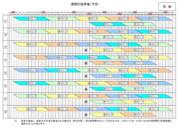 昨日(3/17)は予定以上に電力使用量が増加して、供給力ぎりぎりになるということで、急遽政府が大規模停電の可能性があるので家庭や企業に節電を強く要請するという事態になりました。おかげで多くの会社等では早い帰宅を奨励したために、都内の駅では18時ごろは大混雑。再び大地震の日や翌日に似た混乱が発生してしまいました。そのせいかいつもよりはやく3/17のうちに翌日の計画停電のお知らせがリリースされています。3月18日(金)の計画停電の実施予定等について.3月18日 第1グループ 計画停電のお知らせ.3月18日 第2グループ 計画停電のお知らせ.3月18日 第3グループ 計画停電のお知らせ.3月18日 第4グループ 計画停電のお知らせ.3月18日 第5グループ 計画停電のお知らせ.<グループ毎の計画停電の予定時間帯> 第1グループ 6:20~10:00 第2グループ 9:20~13:00 第3グループ 12:20~16:00 第1グループ 13:50~17:30 第4グループ 15:20~19:00 第2グループ 16:50~20:30 第5グループ 18:20~22:00電力の需要予測は前日を大幅に超えています。3/16発表の需要予測 ○3月16日の需給予測 需要想定 3,500万kW(18時~19時) 供給力 3,300万kW ○3月17日の需給予測 需要想定 3,800万kW(18時~19時) 供給力 3,350万kW3/17発表の需要予測○3月17日の需給予測 需要想定 4,000万kW(18時~19時) 供給力 3,350万kW○3月18日の需給予測 需要想定 4,000万kW(18時~19時) 供給力 3,400万kW寒さがぶりかえしていますし、おそらく企業等は停電の実施されない時間帯に業務時間帯をずらして、すこしでも仕事ができるように体制を変えていこうとしますが、そうすると結果的に使用する電力は停電前に近づいていってしまいます。停電が実施されたエリアは東京23区を除いた全域となりました。計画停電マップ Yahoo!地図 Googleマップ今後、停電が2回実施されるグループが増えてしまうかもしれません。
