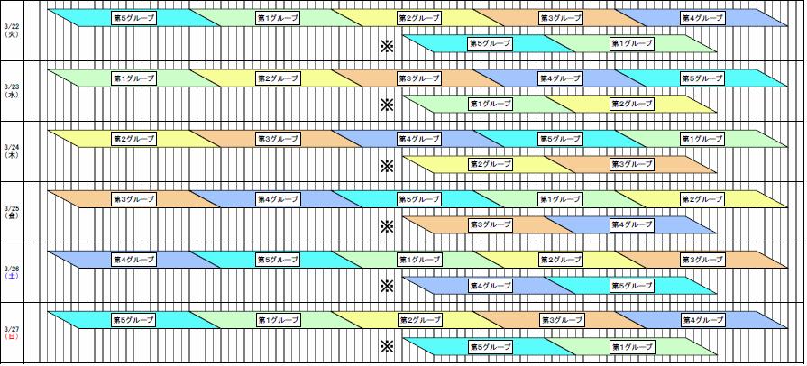 3/15(火)の計画停電は次のように決まったようです。第3グループ 6:20~10:00第4グループ 9:20~13:00第5グループ 12:20~16:00第1グループ 15:20~19:00第2グループ 18:20~22:00グループ分け栃木茨城群馬千葉神奈川東京埼玉山梨静岡毎日計画停電の内容がかわってくるとすると、翌日の予定がなかなかたてられなくて困るのですが、グループは共通で、毎日時間帯をシフトしていくようです、週間計画停止は次のリンクで見ることができます。週間計画停止イメージ詳しくは東京電力のホームページを見てください。