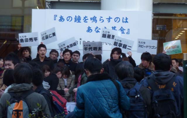 渋谷を歩いていたら、なにやら人だかりがあります。人通りを整理している人もいるので何かと思ってみてみると、渋谷パルコPart1前で、募金活動をしていました。「あの鐘を鳴らすのはあなた基金」という名目でホリプロのタレントが並んで募金活動をしています。タレントさんたちの近くに行って、募金をして、握手をしたり、記念撮影をしている人もいました。自分がとおりかかったときには「島田秀平」「佐藤仁美」「佐々木崇雄」「千代将太」「飯星景子」「載寧龍二」「スピードワゴン」といった人たちが並んで募金を募っていました。上の写真のように、後ろのほうでマネージャーらしき人がタレントさんの名前を掲げています。集まった募金は日本赤十字社を通して災害復興義援金として役立てられます。「あの鐘を鳴らすのはあなた基金」については次の動画で案内しています。ニコニコ動画「ホリプロちゃんねる」 (3月19日(土)10時より開始)YouTubeの「HORIPRO CHANNEL」 (3月19日(土)10時より開始)3/26(土)は渋谷パルコ Part1前で10:30~17:00の時間帯にホリプロのタレントが時間単位で交代しながら募金活動をしていました。3/27(日)は11:00~16:00の時間帯に新宿サブナード福家書店でおなじような募金活動を行うようです。新宿に出かける用事のある人、募金はしたいけどどこで募金すればよいかわからない人、タレントさんと握手をしたい人、こういった機会を利用するといいと思います。